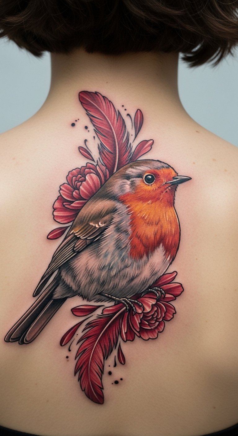 Go bold with bright hues that pop on your skin. This design mixes old-school lines with modern flair. Draw it out on paper first with markers. It’s an affordable start. Focus on the red breast for that passion pop. Place it on your chest for a personal touch. A tip: Look for local artists who offer flash deals to cut costs. Use household items like ink pens to practice shading at home. Keep strokes simple and fun. This style tells your story of resilience. Try a DIY mock-up: Print a template and color it in. You’ll see how it fits. No big expenses needed. Just grab what you have and experiment. Make it yours with extra details like a flower.