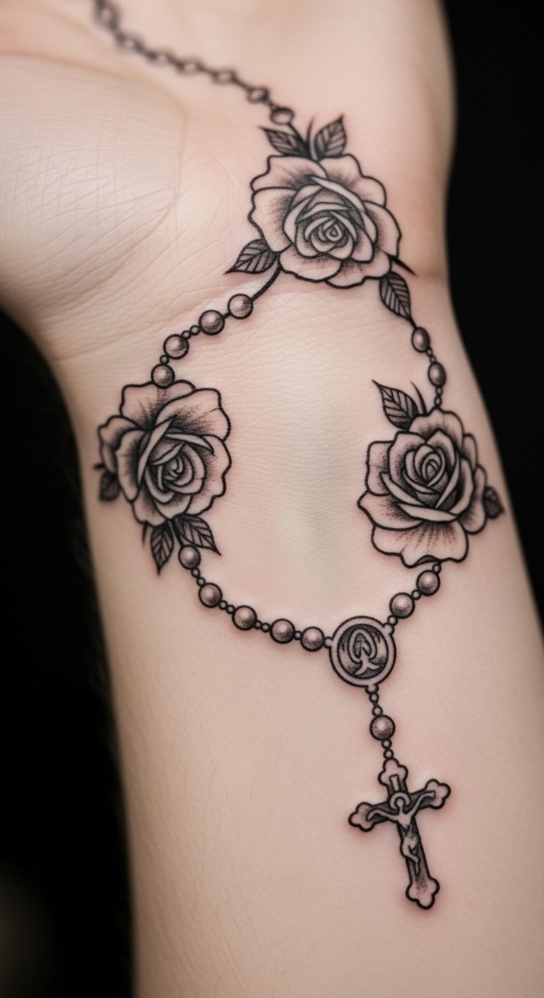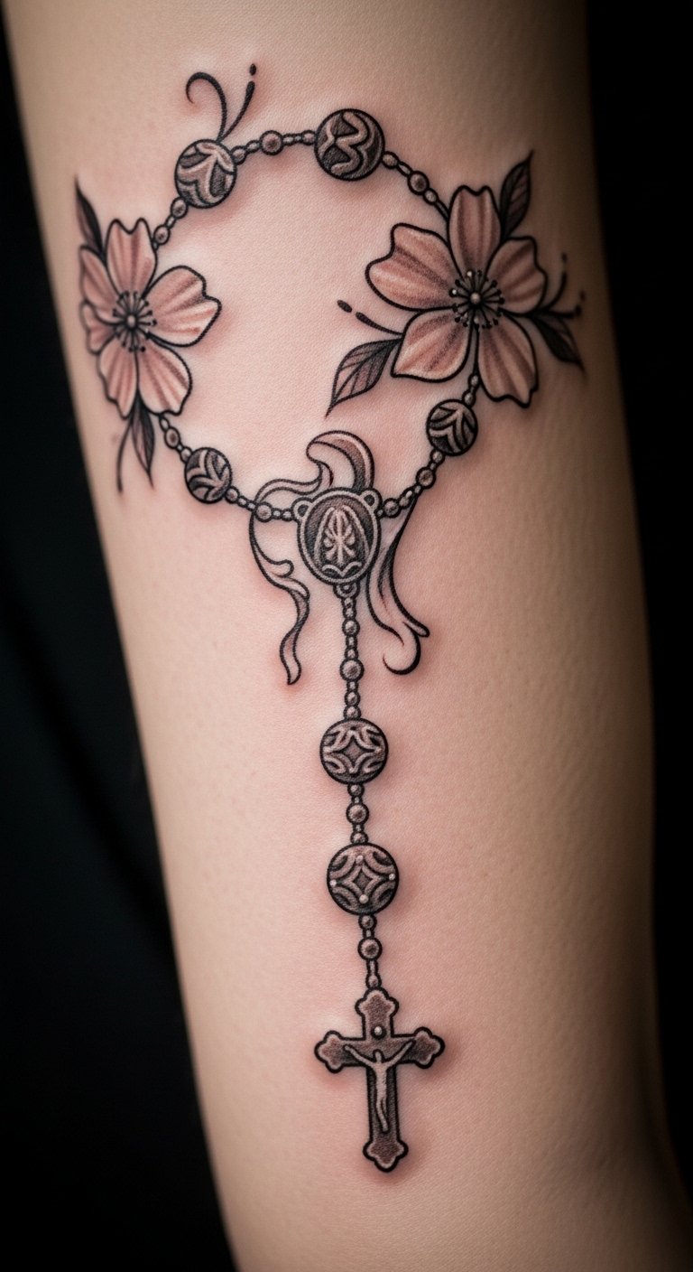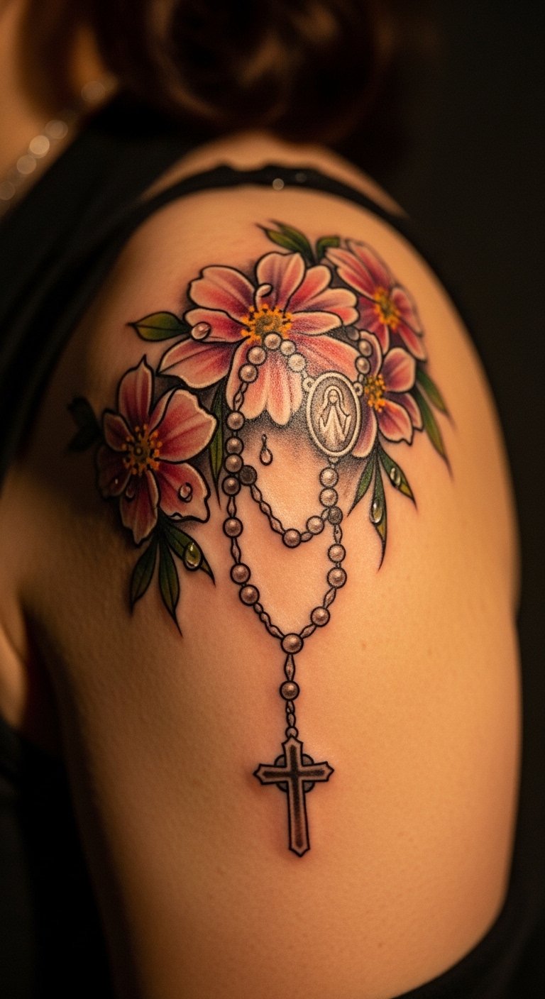 A rosary with cross and flowers mixes faith and beauty seamlessly. See beads linked to a cross, framed by simple blooms. Place it on your shoulder for a balance of hide and show. Sketch ideas on a notebook to personalize it. Use online templates you can print for free. Look for deals at walk-in studios to save money. Create a mock-up with beads and flowers from your garden. Emphasize: cross and flowers add layers of meaning. Pick flowers that reflect your story, like roses for love. Test with stick-on tattoos from a dollar store. This keeps things affordable and fun. Use the design as a daily symbol of growth and peace.