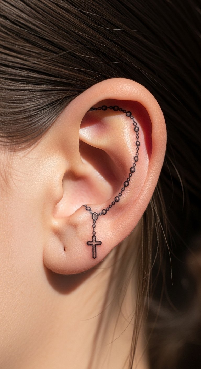 A small behind-the-ear rosary offers quiet spirituality. Think of tiny beads and a cross tucked away. This spot keeps it personal and easy to hide. Jot down thoughts in a journal to plan yours. Download free stencil apps for quick designs. Check local fairs for cheap tattoo options. Make a version with thread behind your ear for a trial. Note: behind-the-ear rosary suits busy days. Choose colors that match your hair for subtlety. Practice with wash-off markers at home. This approach makes it simple and low-cost. Let it remind you of inner strength during tough times.