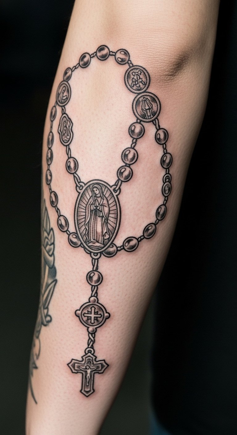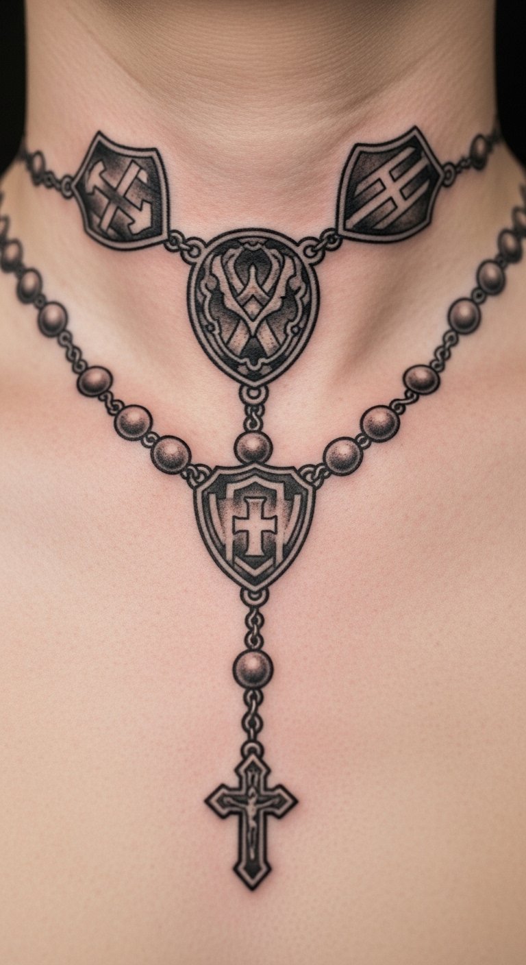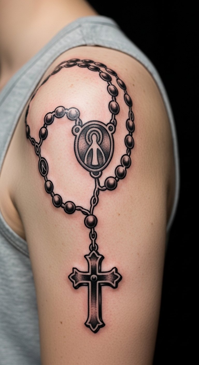 A bold shoulder rosary makes a strong statement of belief. Envision large beads draping your shoulder with a clear cross. This area shows your faith proudly. Draw bold outlines on paper to start. Explore free design software for custom tweaks. Seek out sales at tattoo shops for savings. Use string and beads to mimic it on your body. Focus on: shoulder rosary for impact. Select a design that fits your clothes—sleeveless for display. Try fabric markers on a shirt first. This keeps costs down while you decide. Wear it as a badge of peace in your routine.