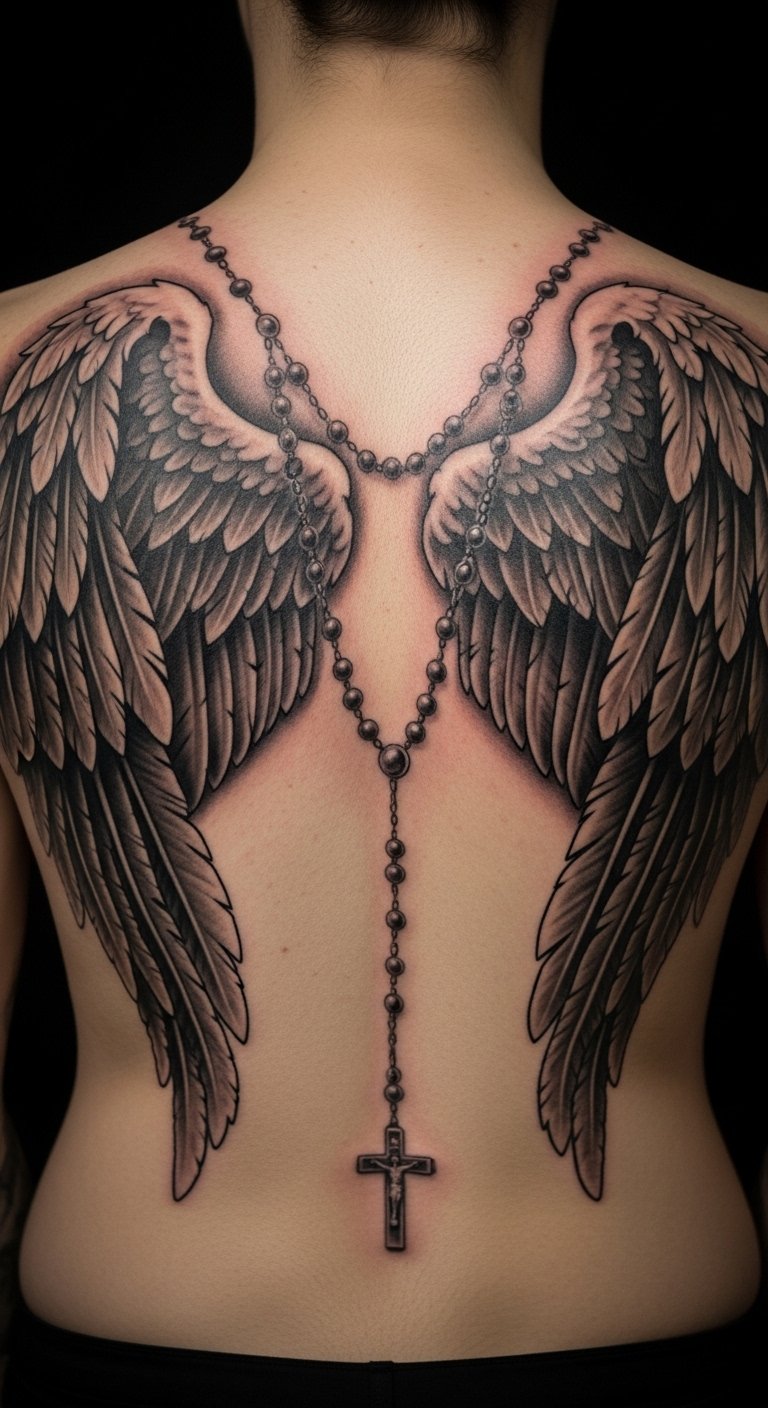A rosary with angel wings symbolizes protection and hope. Picture beads flowing into wide wings on your back. This design adds a layer of safety to your ink. Sketch wings on paper to fit your vision. Grab free online generators for easy layouts. Visit budget studios during promotions. Craft a paper cutout to wear around your neck. Highlight: angel wings rosary for comfort. Place it where it feels empowering, like your upper back. Use craft supplies for a homemade version. This method is practical and fun. Let it guide you toward daily serenity.