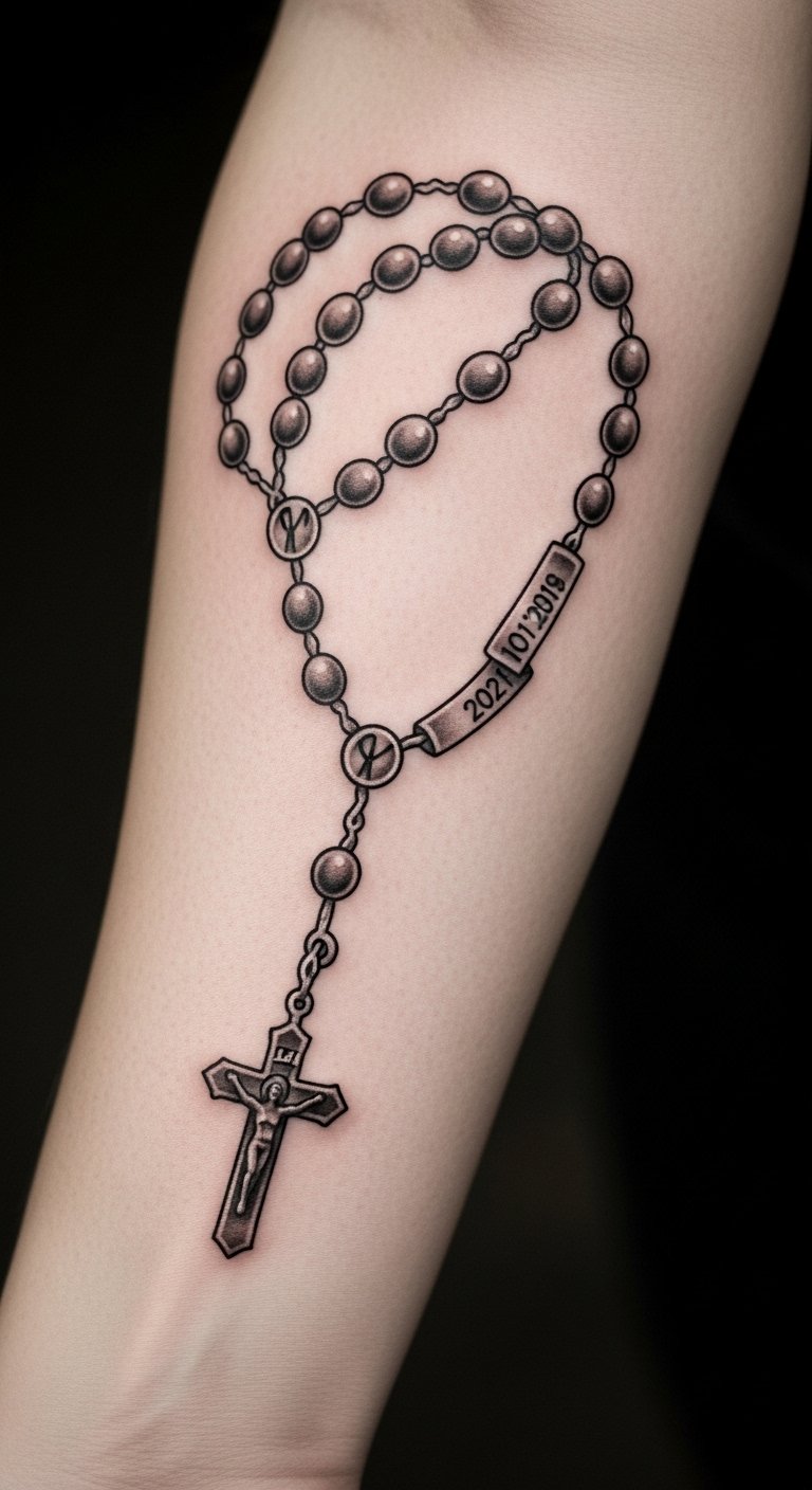 A memorial rosary tattoo honors loved ones with meaning. Imagine beads with a date or name for remembrance. Place it on your forearm for constant access. Write memories in a diary to guide your choice. Find free customizable templates online. Check community events for low-price options. Create a bead bracelet as a stand-in. Key point: memorial rosary keeps stories alive. Add elements like initials for personalization. Use printable stickers for a trial run. This way, it’s simple and heartfelt. Let it bring quiet comfort to your days.