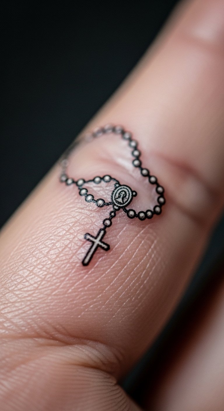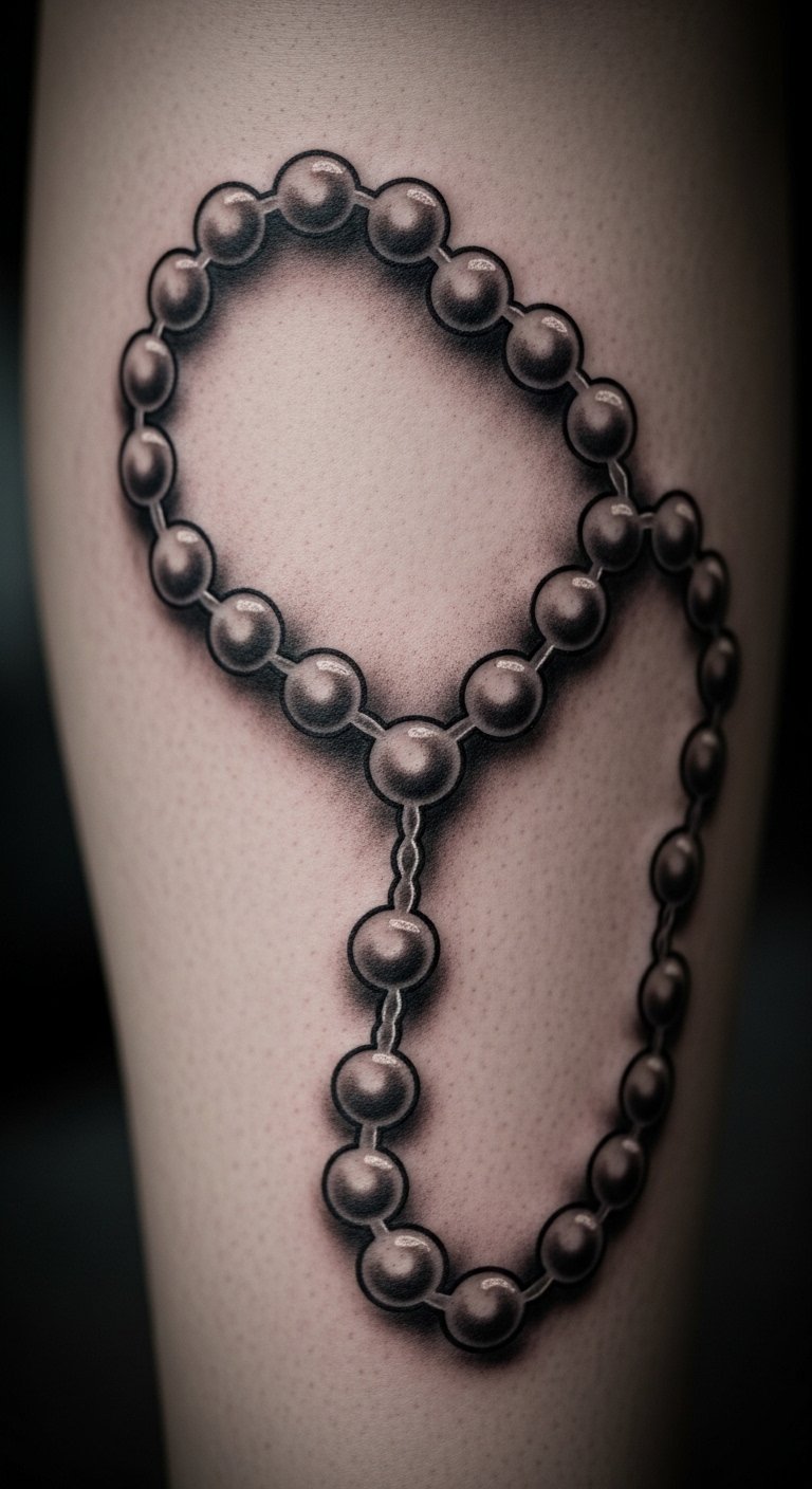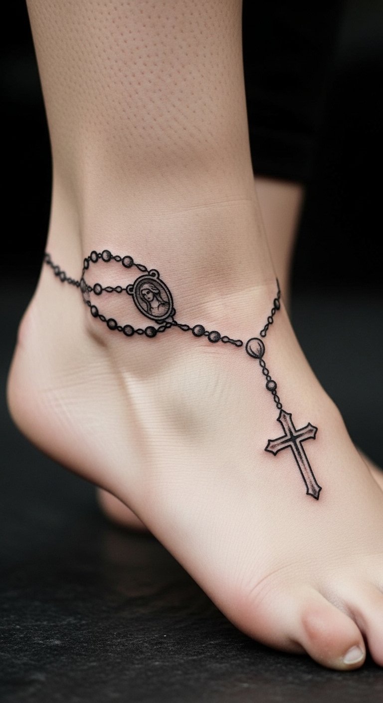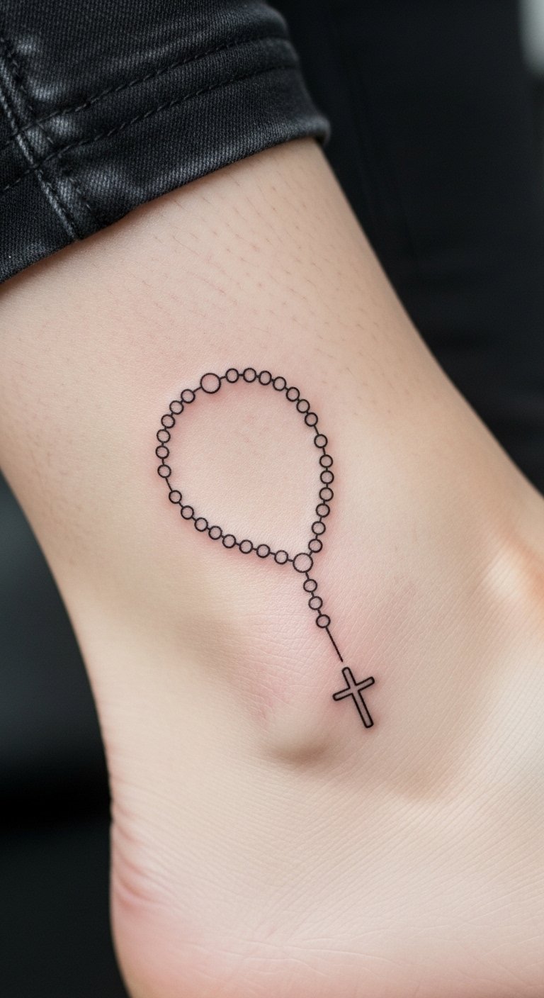 A minimalist rosary outline keeps things clean and modern. See basic lines of beads on your ankle. This style is understated and versatile. Draw outlines on a page to start. Use free vector tools for designs. Find minimalist artists with package deals. Trace it with a pen for a preview. Emphasize: minimalist outline for everyday wear. Place it low for discretion. Try drawing on with eyeliner. This approach is easy and cheap. Let it offer a subtle path to tranquility.