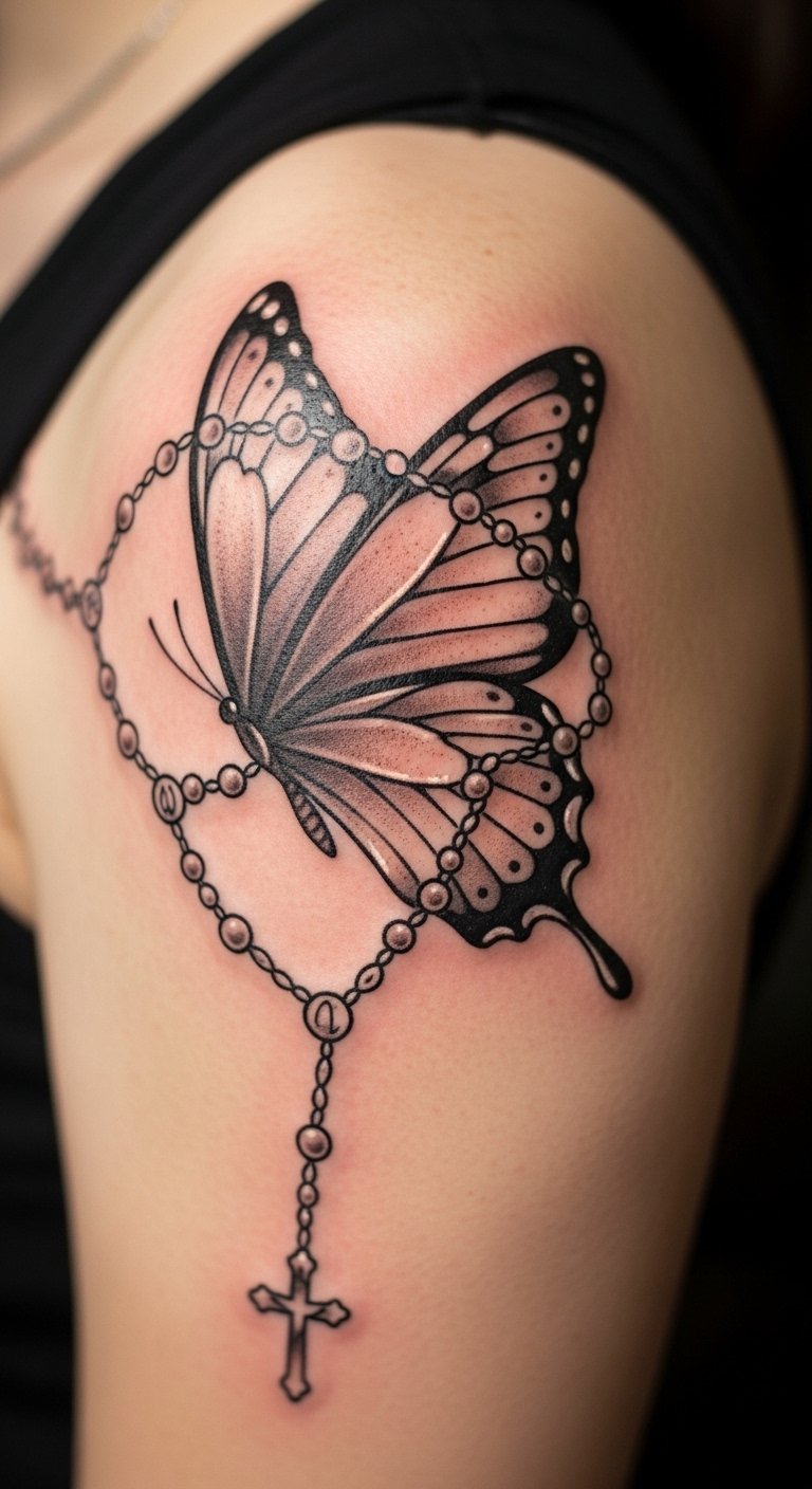 A rosary combined with butterfly represents change and spirit. Picture beads linked to butterfly wings on your shoulder. This design feels transformative. Jot down butterfly ideas in notes. Access free combo templates online. Look for butterfly-themed sales. Make a butterfly pin with beads. Highlight: butterfly rosary for renewal. Choose wings that suit your story. Use craft paper for a test design. This makes it accessible and fun. Use it as a symbol of fresh peace.