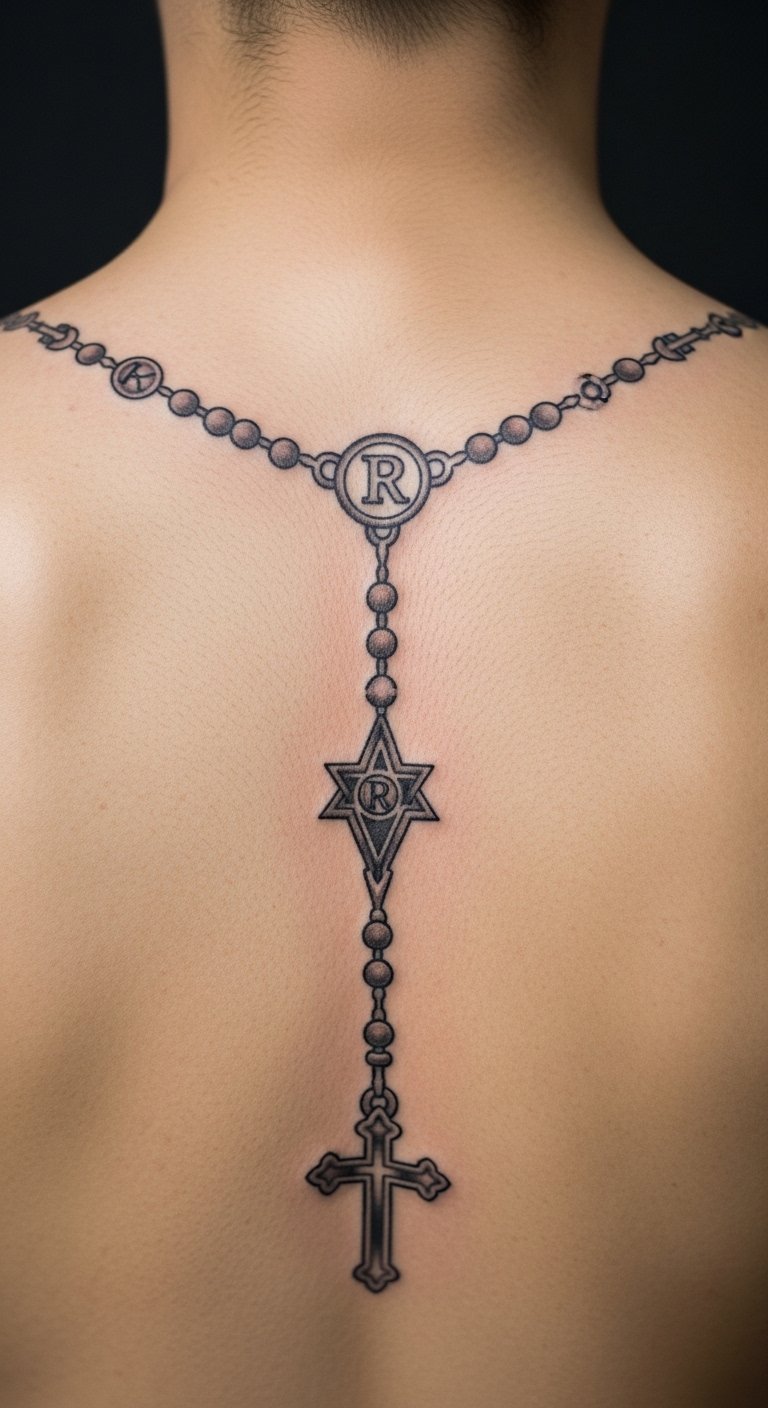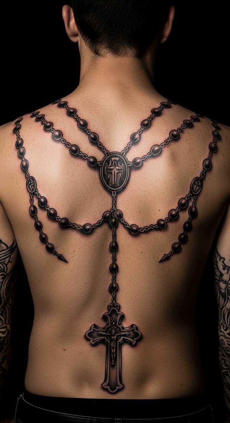 A large back rosary design shows bold devotion. Envision sweeping beads across your back with a big cross. This spot makes a grand statement. Plan on paper for the full effect. Use free large-scale apps for layouts. Seek back tattoo packages at studios. Drape a chain across your back for a try. Focus on: back rosary for presence. Adjust size to your comfort. Practice with a large sticker. This keeps costs manageable. Let it anchor your inner calm.