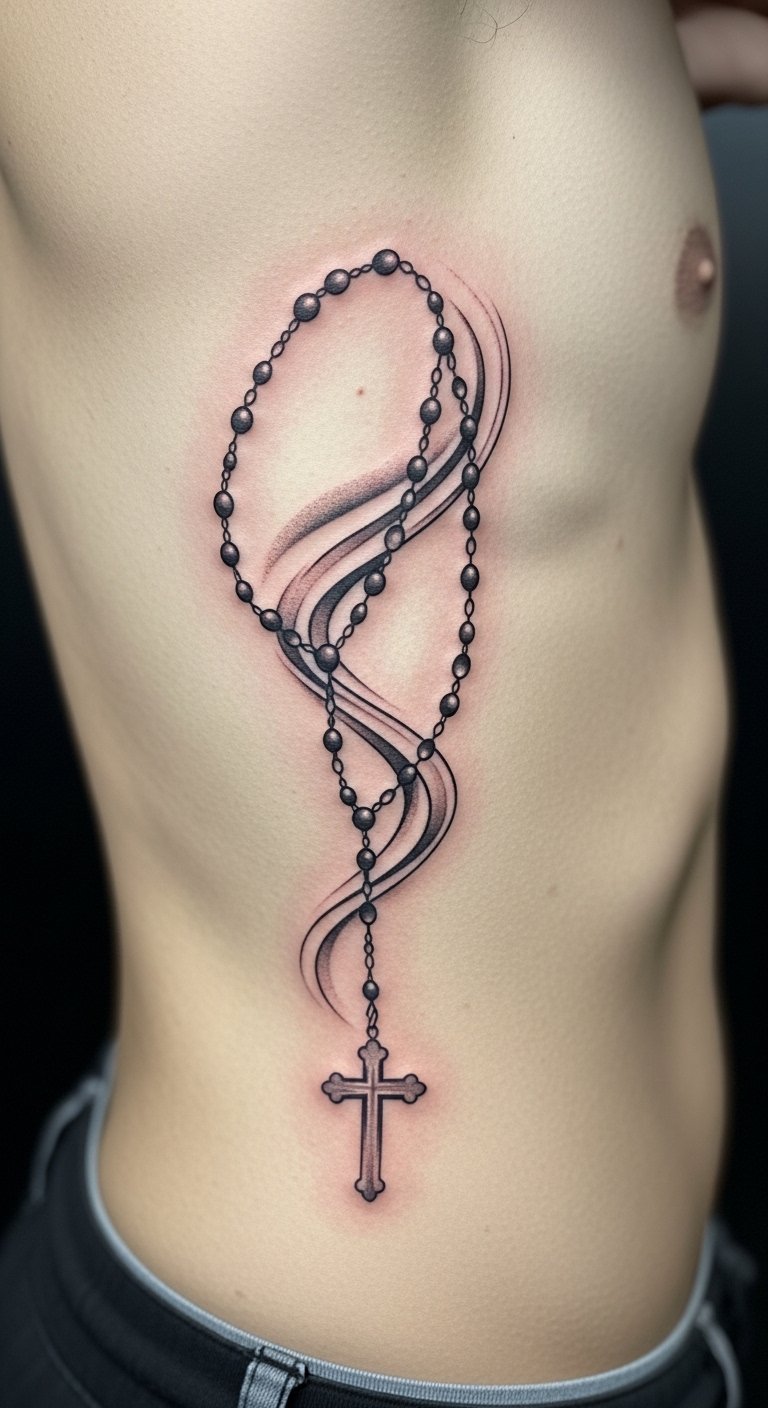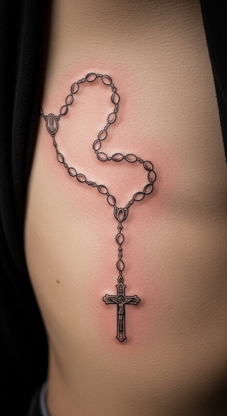 A rosary on ribs offers private inspiration. Think beads curving along your side. This area stays hidden when needed. Sketch on your side for accuracy. Find free rib-specific designs online. Check for discreet tattoo offers. Use ribbon to simulate on your body. Key: ribs rosary for privacy. Pick a design that fits your shape. Test with body paint. This method is practical and low-key. Wear it as a secret source of peace.