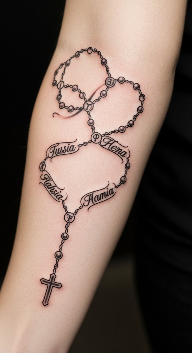 A heart-shaped rosary tattoo combines love and faith in one simple design. Picture beads looping into a heart with a cross at the center. This style fits on your chest or wrist for easy daily wear. Start with a sketch on paper to see how it looks. Use free online tools like Canva to create your own template. Keep costs low by visiting local artists who offer flash designs. Add personal touches, like a small flower, using affordable henna kits for a trial run. Bold the key: heart-shaped rosary stands out for its emotional depth. Think about placement to match your routine—hidden for work, visible for inspiration. Grab a mirror and trace a similar shape on your skin with a washable marker. This approach lets you test ideas without commitment. Enjoy the peace it brings as a quiet reminder of hope.