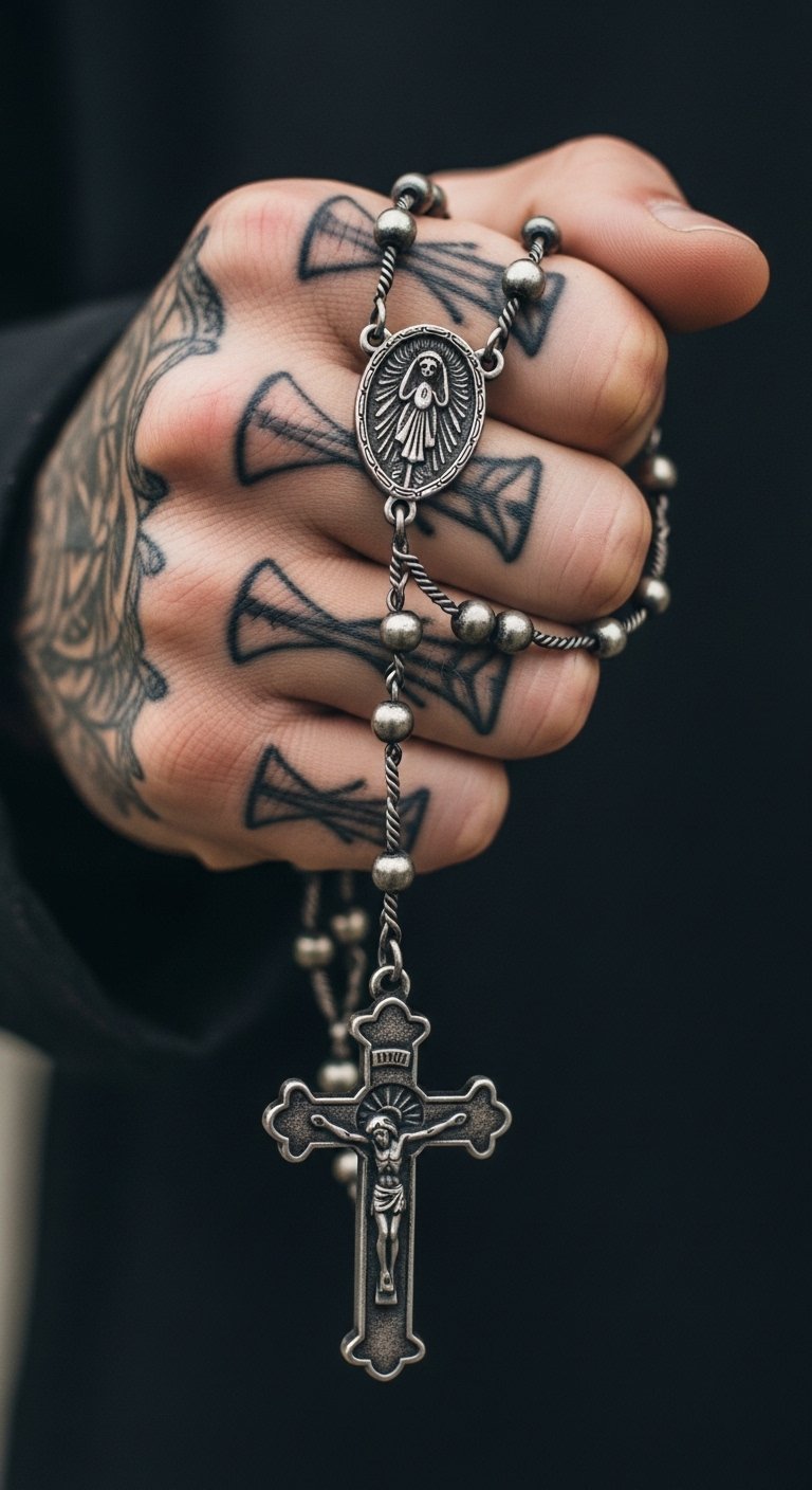 A rosary and cross on hand keeps faith in view. Picture beads and cross on your palm. This spot is always with you. Draw on your hand for trials. Find free hand templates. Check for hand tattoo specials. Wrap string around your fingers. Highlight: hand rosary for visibility. Choose a design for daily tasks. Use hand stamps for testing. This makes it easy and cheap. Carry it as a constant peace keeper.