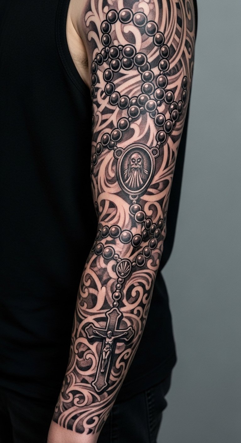 A full arm rosary sleeve covers with meaning. See beads running your arm. This design is comprehensive and bold. Plan sleeve sketches. Use free sleeve apps. Seek sleeve discounts. Drape beads on your arm. Focus on: arm sleeve for coverage. Adjust for your arm. Test with arm bands. This method saves money. Let it wrap you in peace.