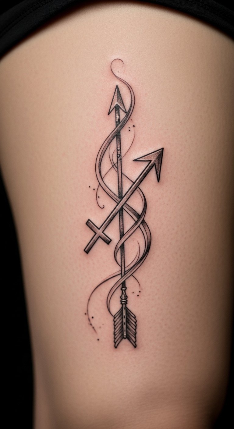 Opt for a thigh tattoo if you want something private yet versatile. This spot hides easily under clothes but shows off when you choose. Pick a small arrow design to start. Look for affordable studios online and compare prices. Sketch ideas on paper with pencils from home. Add flowers for a feminine touch using free drawing tools. Henna versions cost pennies and fade fast. Keep the size medium for less pain and cash. This placement works for daily life and lets you express your optimistic nature simply.