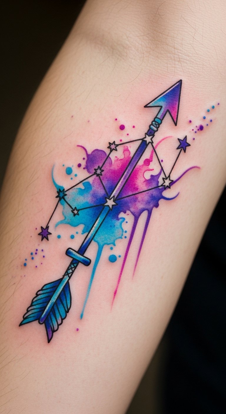 Add a soft touch with watercolor effects on your Sagittarius tattoo. Blurry colors around an arrow create a dreamy feel. Stick to smaller sizes for affordability. Experiment with watercolors from your art supplies at home. Free apps let you preview designs on photos. Look for sales at supply stores for materials. This style washes easier and costs less upfront. Pair it with stars for a celestial twist. It captures that free-spirited energy in a fun, low-key way.