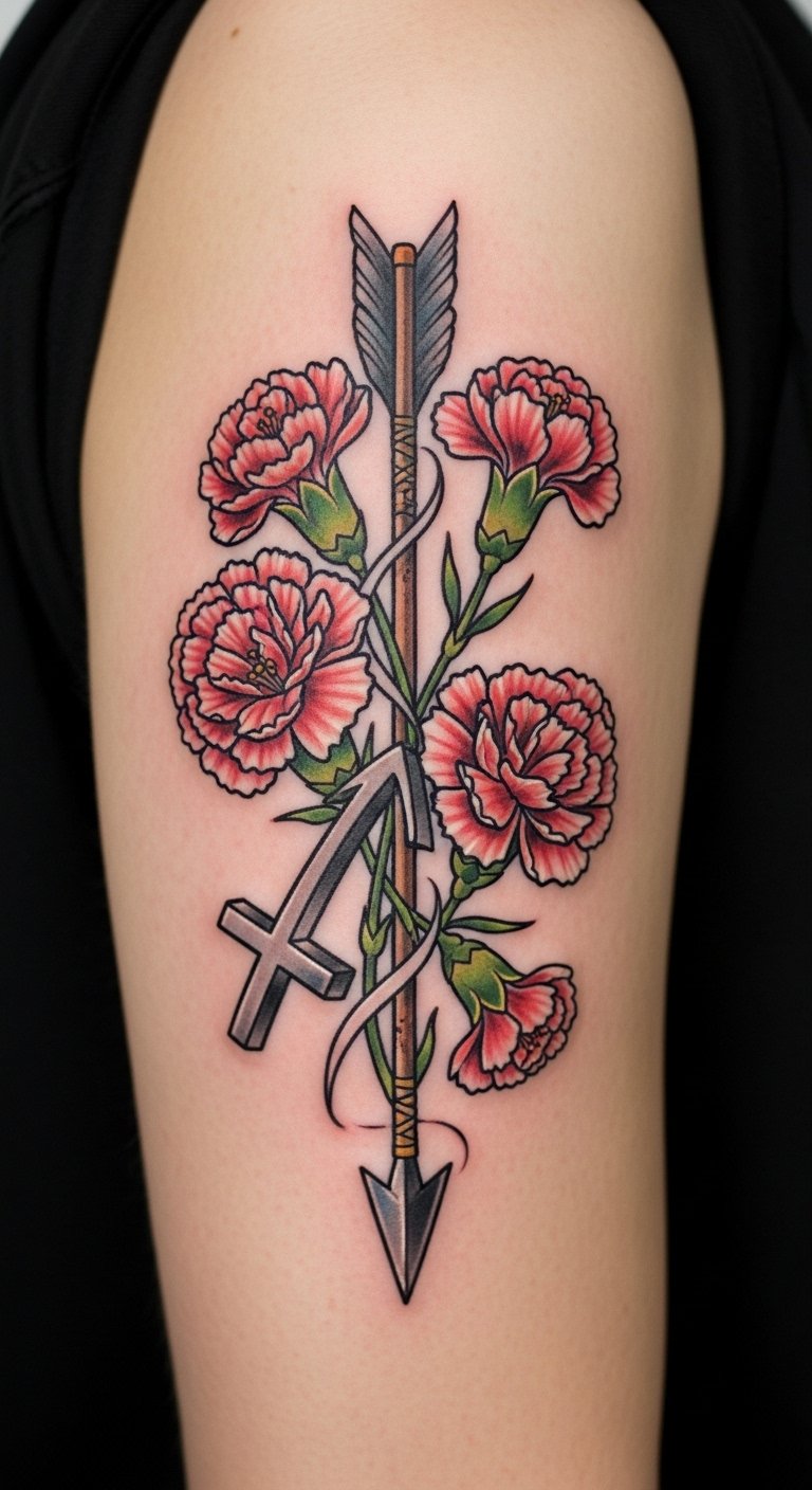 Incorporate carnations for a floral boost in your Sagittarius ink. These flowers add beauty to the archer symbol. Choose a shoulder spot for balance. Sketch flowers with colored pencils from home to save money. Free floral patterns online make planning simple. Use fabric markers for temporary tests. Artists might offer discounts for combined elements. This design blends strength with softness affordably. It lets you show your personality through everyday creativity.