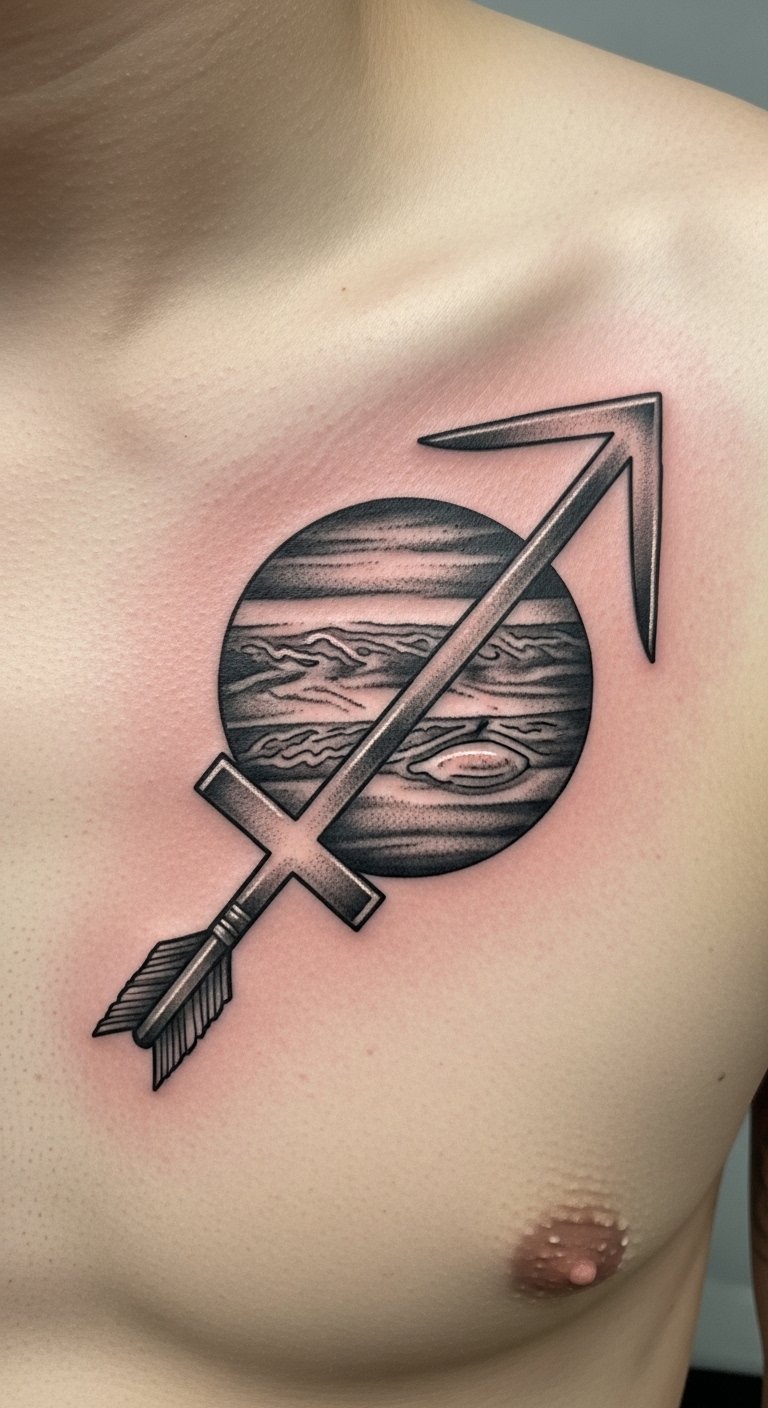Blend in the Jupiter glyph for deeper astrological meaning. This symbol ties to Sagittarius roots in a clean design. Put it on your chest for a personal touch. Draw glyphs using free apps on your device. Paper and pen let you experiment cheaply. Local spots often have glyph specials. Keep it small for quick, budget sessions. This adds layers without extra cost. It highlights your sign’s essence in a straightforward manner.