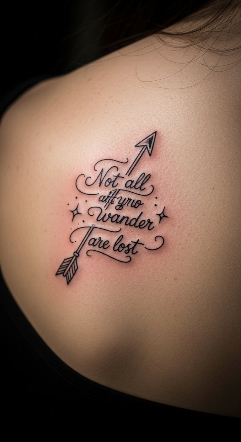 Pair your tattoo with quotes like “Adventure Awaits” for motivation. Place it along an arrow on your back. Write quotes in notebooks first to fit your style. Free fonts online help with planning. Sticker versions cost little and peel off easy. Shops may bundle text with symbols cheaply. This setup inspires daily without much investment. Bold the words for emphasis in your design.
