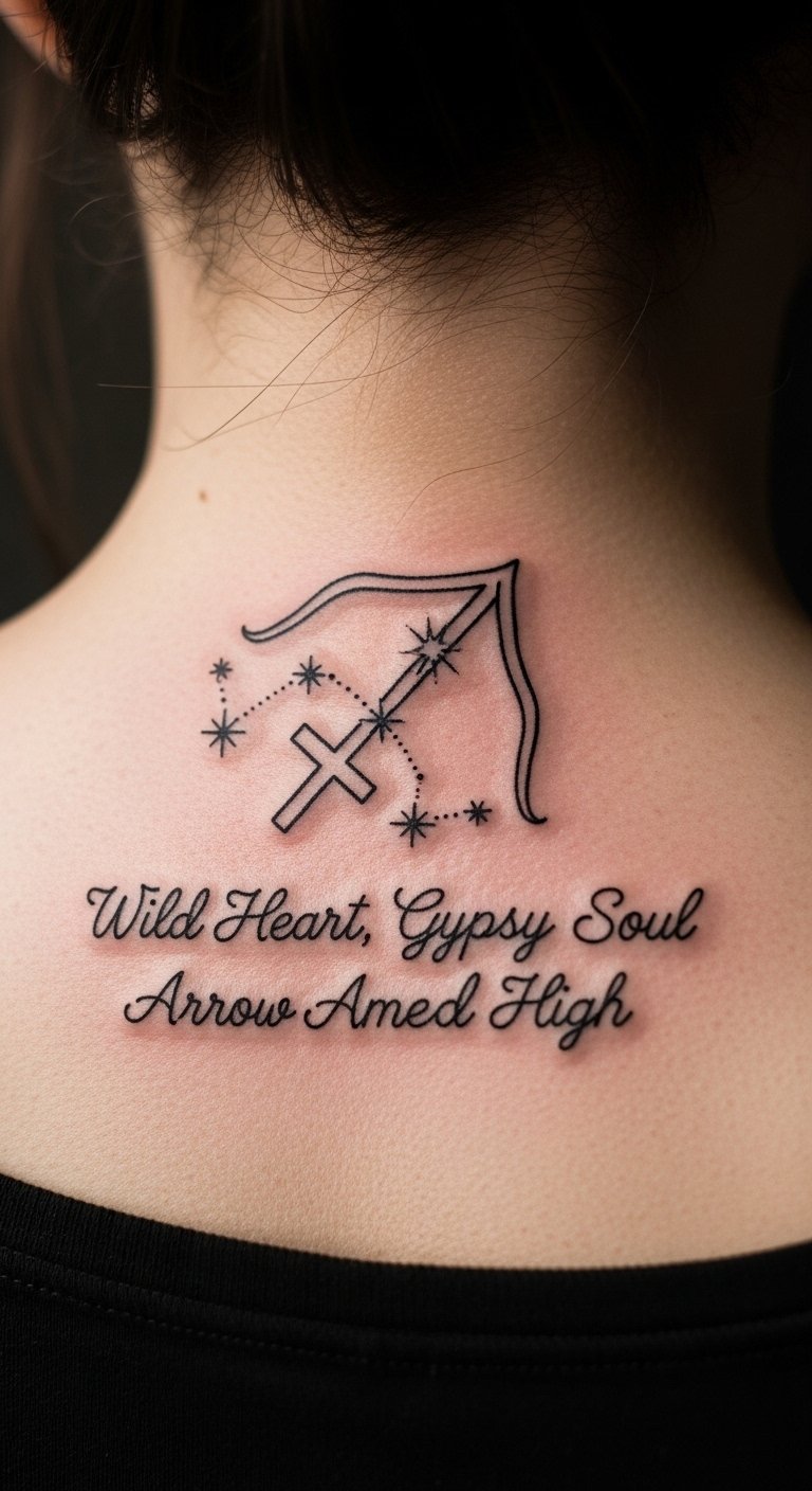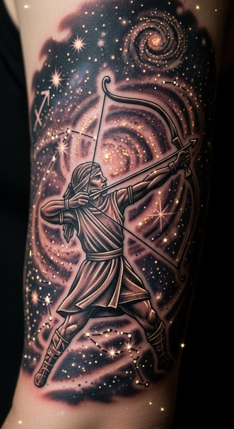 Add stars for a cosmic feel in your Sagittarius tattoo. Scatter them behind an arrow for magic. Try your arm for visibility. Draw stars with basic supplies from home. Free star templates make it simple. Glow-in-the-dark stickers test the idea cheaply. Artists often discount background elements. This design sparks wonder without high costs. It captures exploration vibes easily.