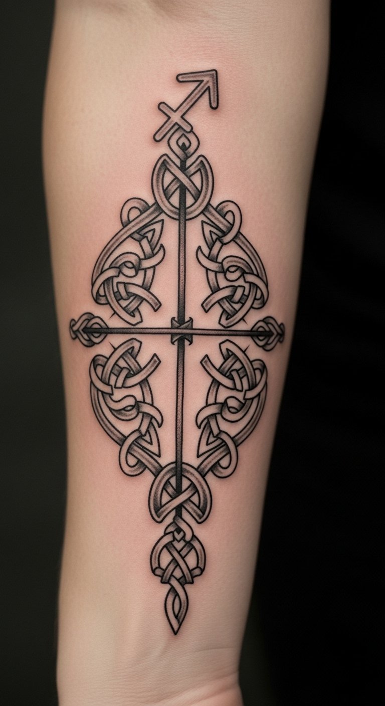 Weave Celtic knots into your arrow for a nod to traditions. This design symbolizes unity and adventure. Choose your forearm for a subtle spot. Draw knots with string at home. Free Celtic guides online assist. Yarn crafts let you prototype cheap. Shops may have knot specials. It adds meaning without much expense.