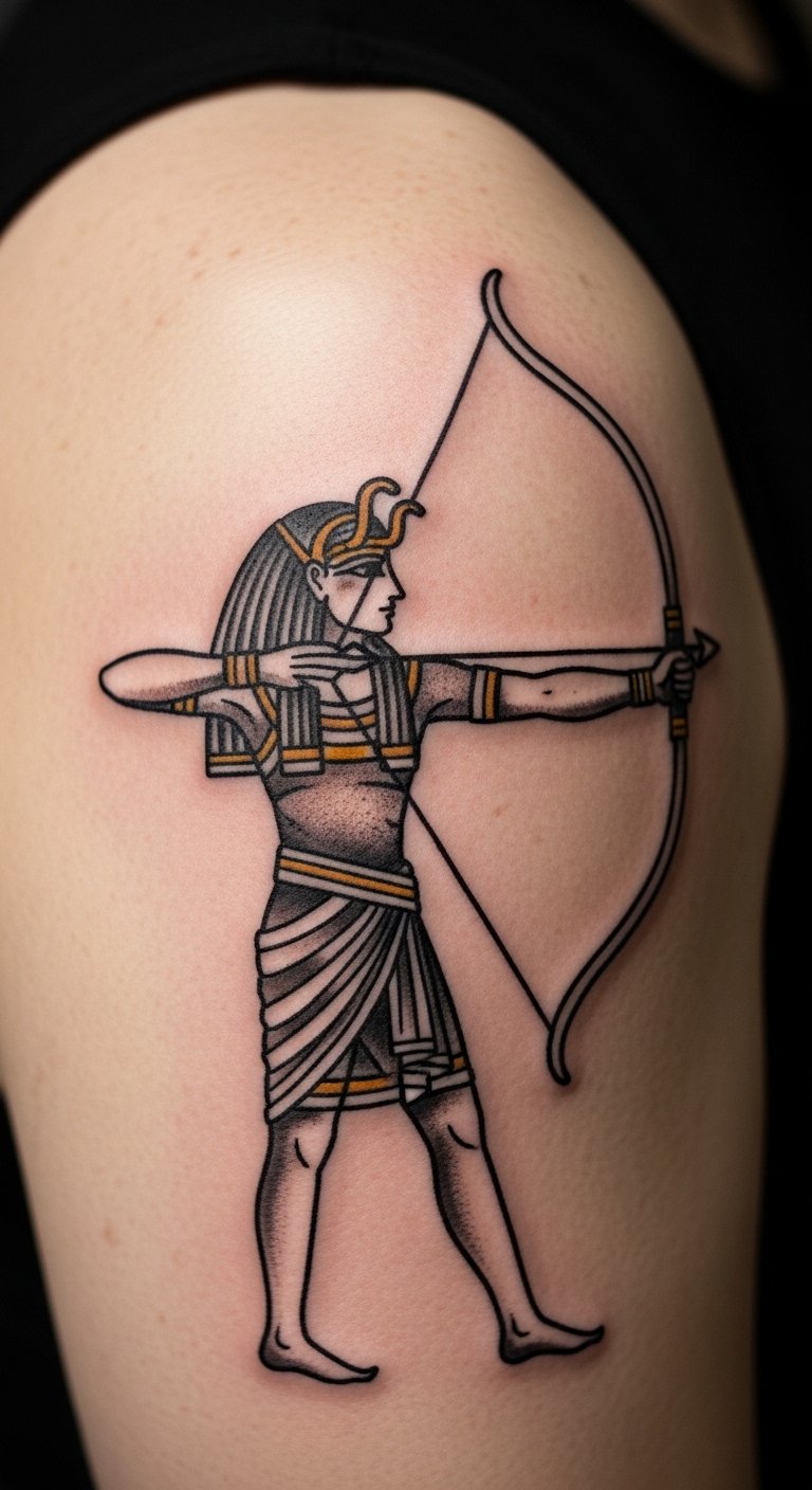 Draw from Egyptian themes for an ancient archer tattoo. Add simple hieroglyphs around the bow. Place it on your shoulder. Sketch hieroglyphs using free apps. Paper cutouts help visualize. This keeps costs low and creative. It honors history in a fun way.