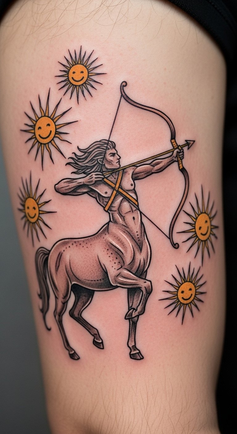 Add sun symbols for optimism in your tattoo. They brighten the archer design. Try your arm. Draw suns at home cheaply. This lifts spirits easily.