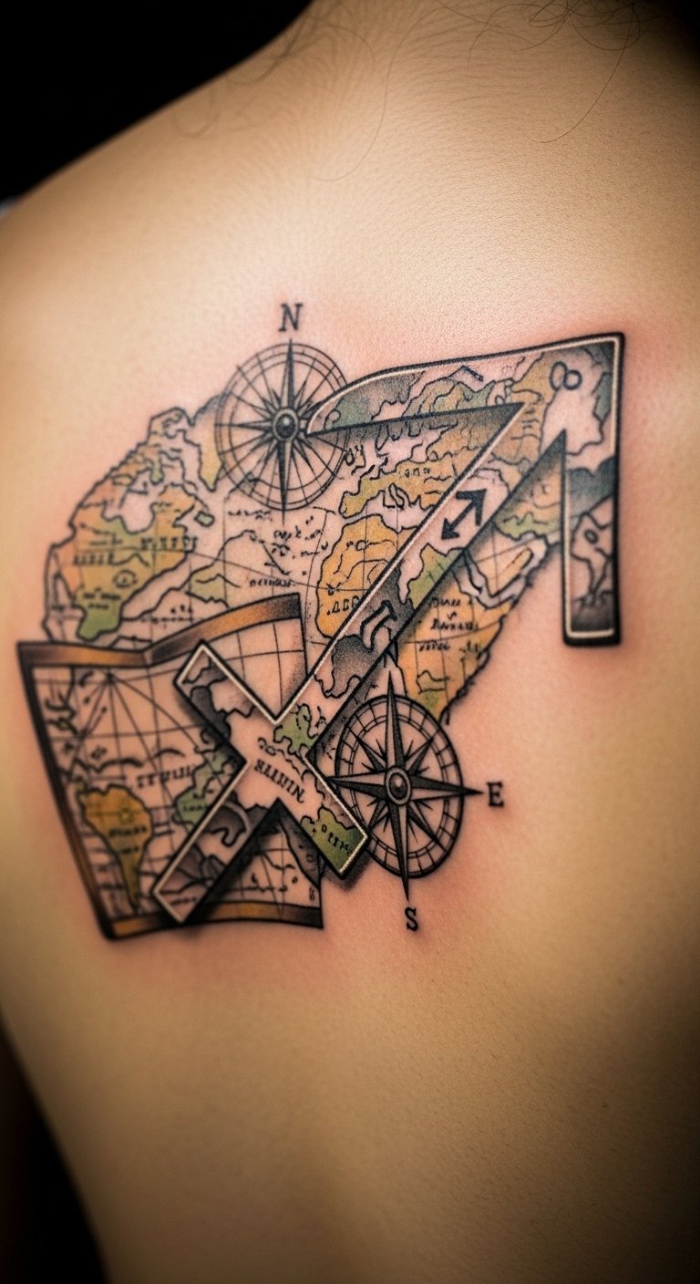 Include maps in your arrow for adventure. This motif inspires journeys. Put it on your back. Plan with free maps online. It keeps things exciting and low-cost.