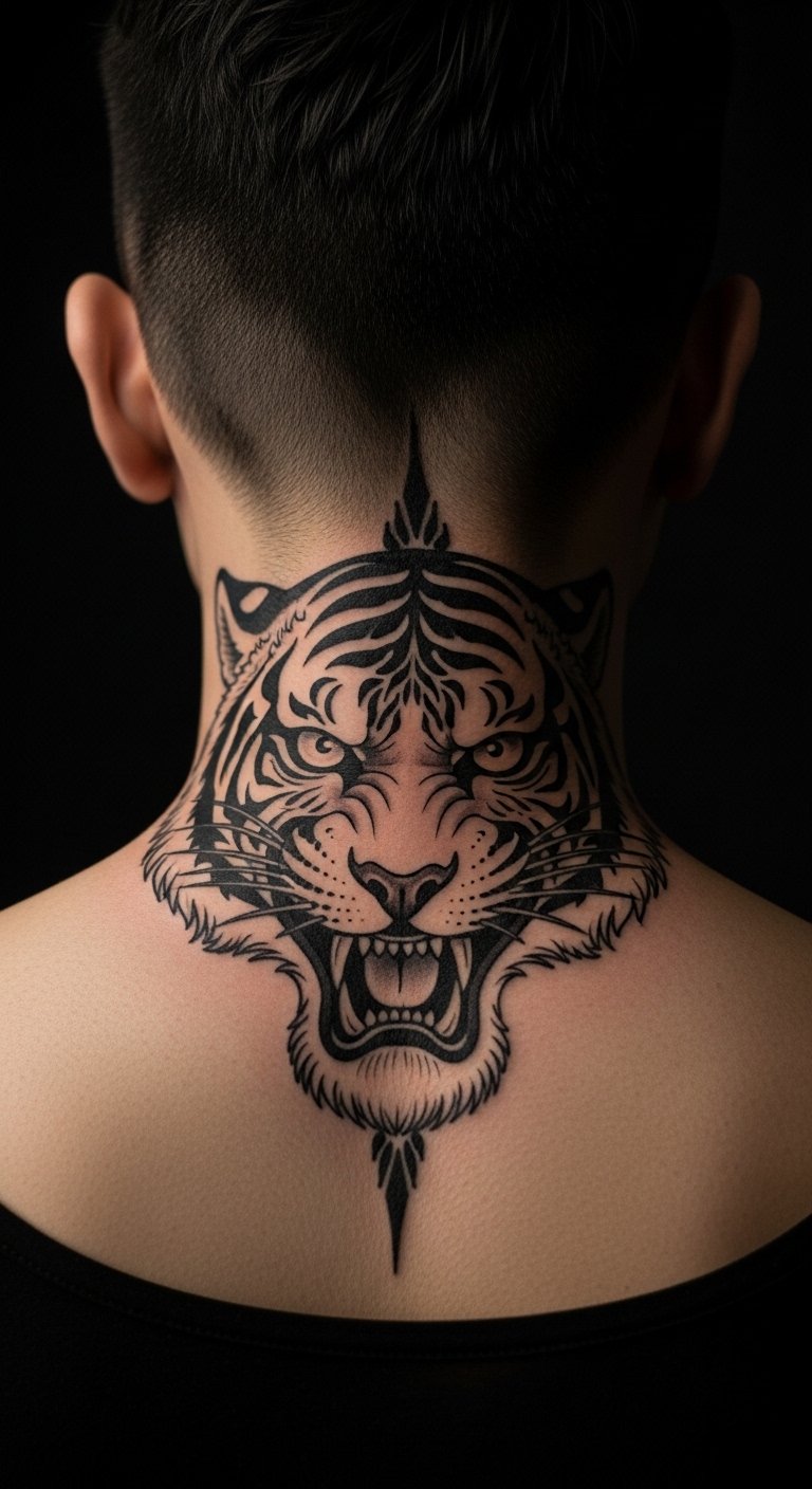 Tiger motifs ignite inner ferocity and power. Place this on your neck. Look for street artists in Thailand. Budget by eating local food. Trace the tiger shape yourself. Find free templates online. Include a walk in nature. Bold key: ferocity tiger. Share stories with peers. This design awakens your bold side.