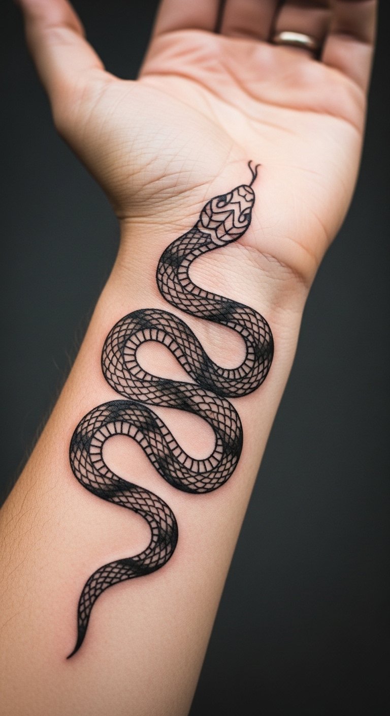 Snake tattoos enhance flexibility and adaptability. Put it on your wrist. Find affordable options in Laos. Walk instead of taxis. Sketch coils at home. Grab a simple pen. Do yoga poses nearby. Bold key: flexibility snake. Discuss with friends. This design helps you adapt quickly.