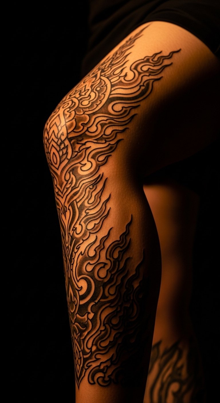 Flame tattoos spark passion and energy. Put on your leg. Check online for cheap options. Walk paths. Draw flames quick. Grab markers. Do energy exercises. Bold key: passion flames. Talk to creatives. This design fuels your drive.