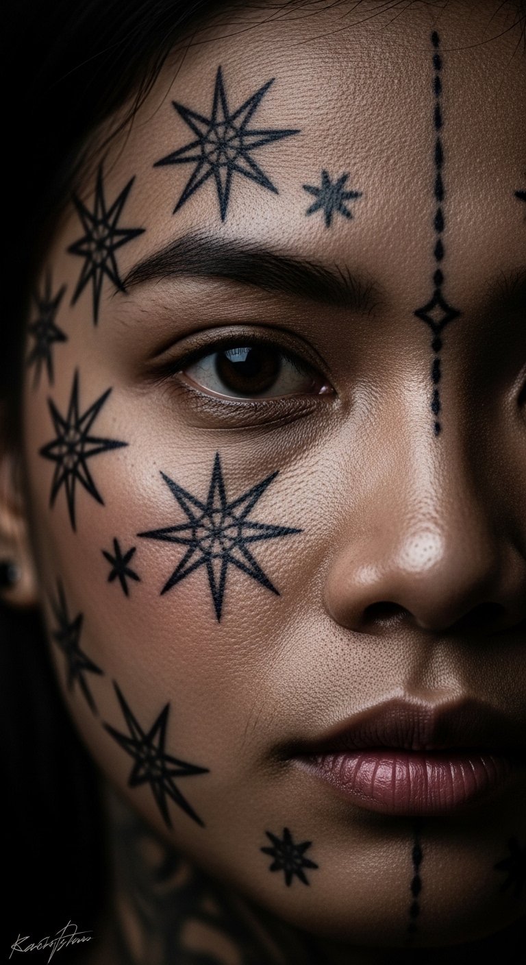 Star designs offer direction and clarity. Place on your face area. Find night market deals. Camp simply. Draw stars easy. Use night skies. Star-gaze often. Bold key: direction stars. Seek advice. This tattoo lights your path.
