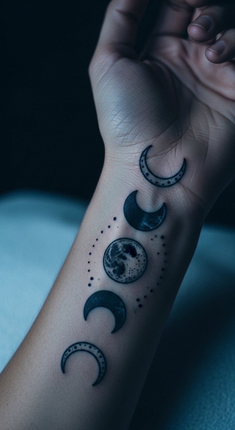 Moon designs enhance intuition and cycles. Ink on your wrist. Night view spots. Moon watch. Sketch phases. Use moon apps. Track nights. Bold key: intuition moons. Intuit choices. This tattoo guides instincts.