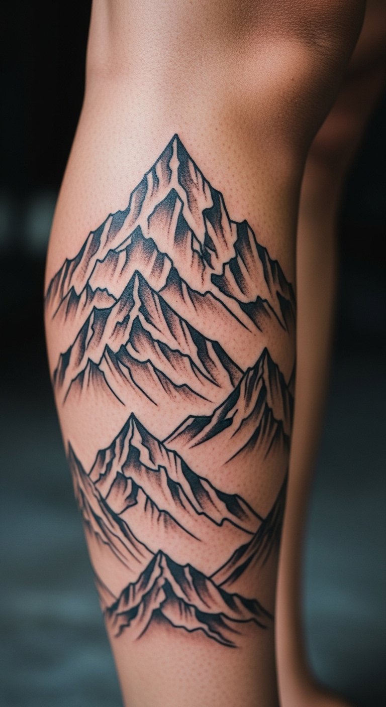 Mountain tattoos build endurance and climb. Ink on your leg. Hilltop searches. Climb hills. Sketch peaks. Use maps. Hike paths. Bold key: endurance peaks. Persist forward. This design conquers challenges.