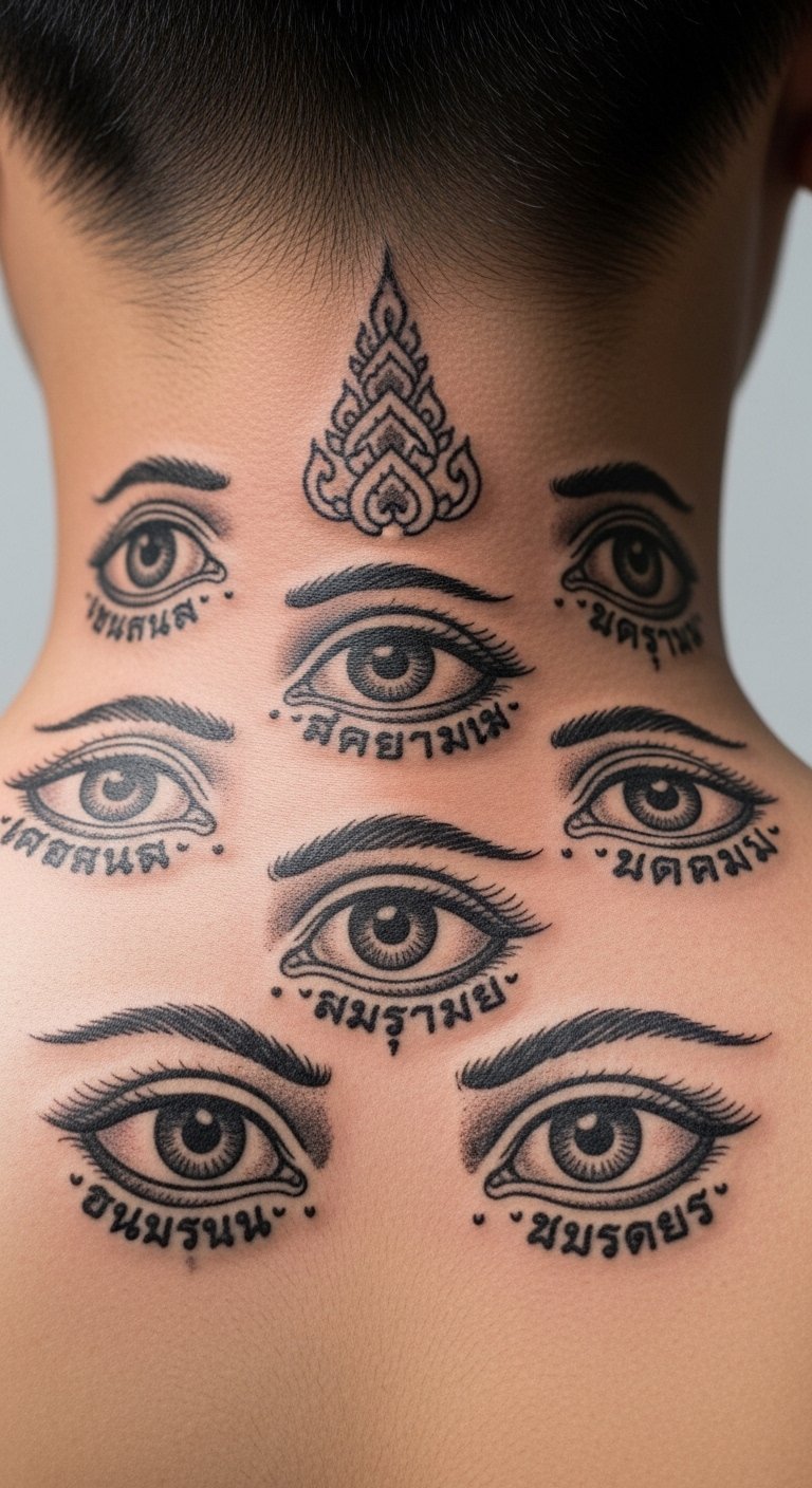 Eye tattoos increase awareness and insight. Put on your neck. Vigil spots. Watch surroundings. Sketch eyes. Use mirrors. Stay alert. Bold key: awareness eyes. See clearly. This design sharpens perception.