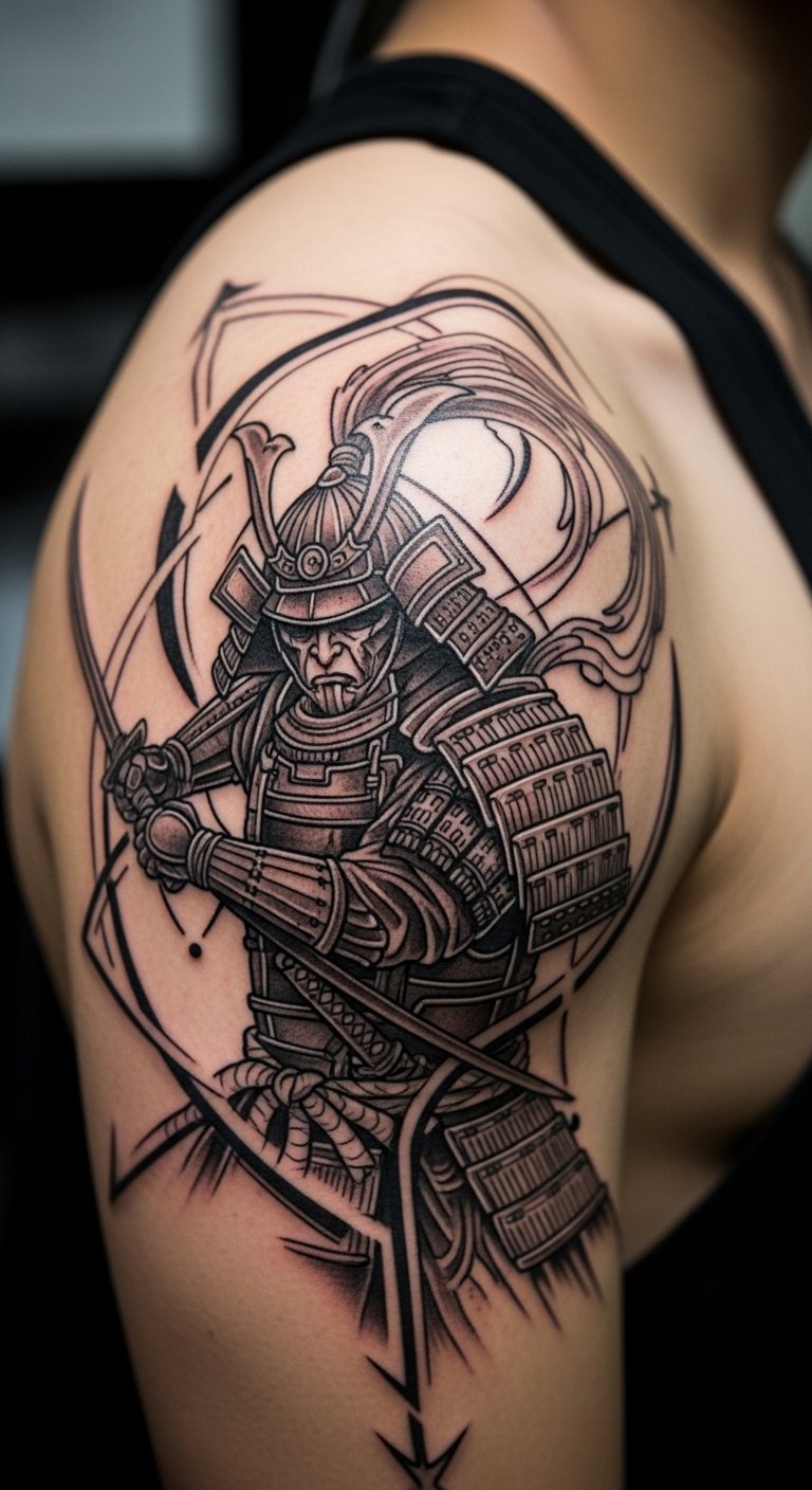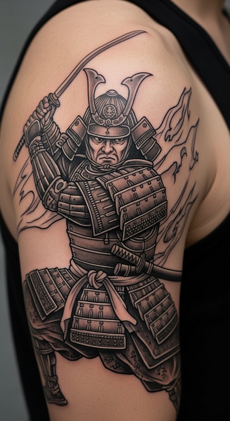 Think of the classic warrior stance as your go-to for timeless strength. This design shows a samurai ready for battle, sword drawn, embodying bravery in every line. Break it down: short, bold strokes highlight the armor and fierce expression. Want to try this at home? Sketch a simple version on paper with a cheap pen, focusing on basic shapes like the sword and stance. It costs nothing and helps you visualize. For the real tattoo, look for local artists who use basic tools—ask around at community events for affordable options under $100 for a small piece. Keep it simple: pick a spot like your arm for easy visibility. Bold key: warrior stance sparks motivation every day. Add a personal twist, like a small symbol for your own battles. This approach makes the tattoo feel achievable and meaningful without breaking the bank.