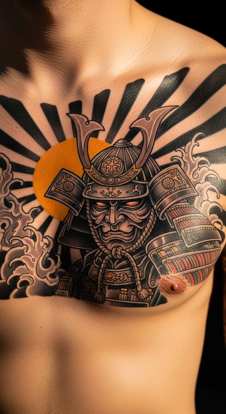 A rising sun behind a samurai guardian represents heritage and new beginnings. This design layers the sun’s rays with a watchful warrior, evoking pride and fresh starts. Get started: trace basic sun shapes on paper with a marker you already own. It’s an easy, no-cost step. For the tattoo, check local shops for walk-in deals under $120. Position it on your chest to feel its energy close. Bold detail: rising sun ties to cultural roots. Add a small twist, like rays pointing upward, by practicing with free drawing tools. Keep it simple to make this design accessible and empowering.