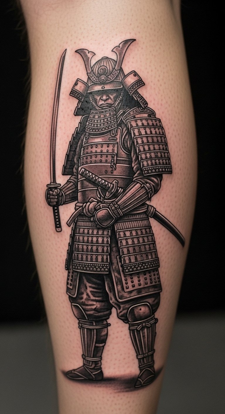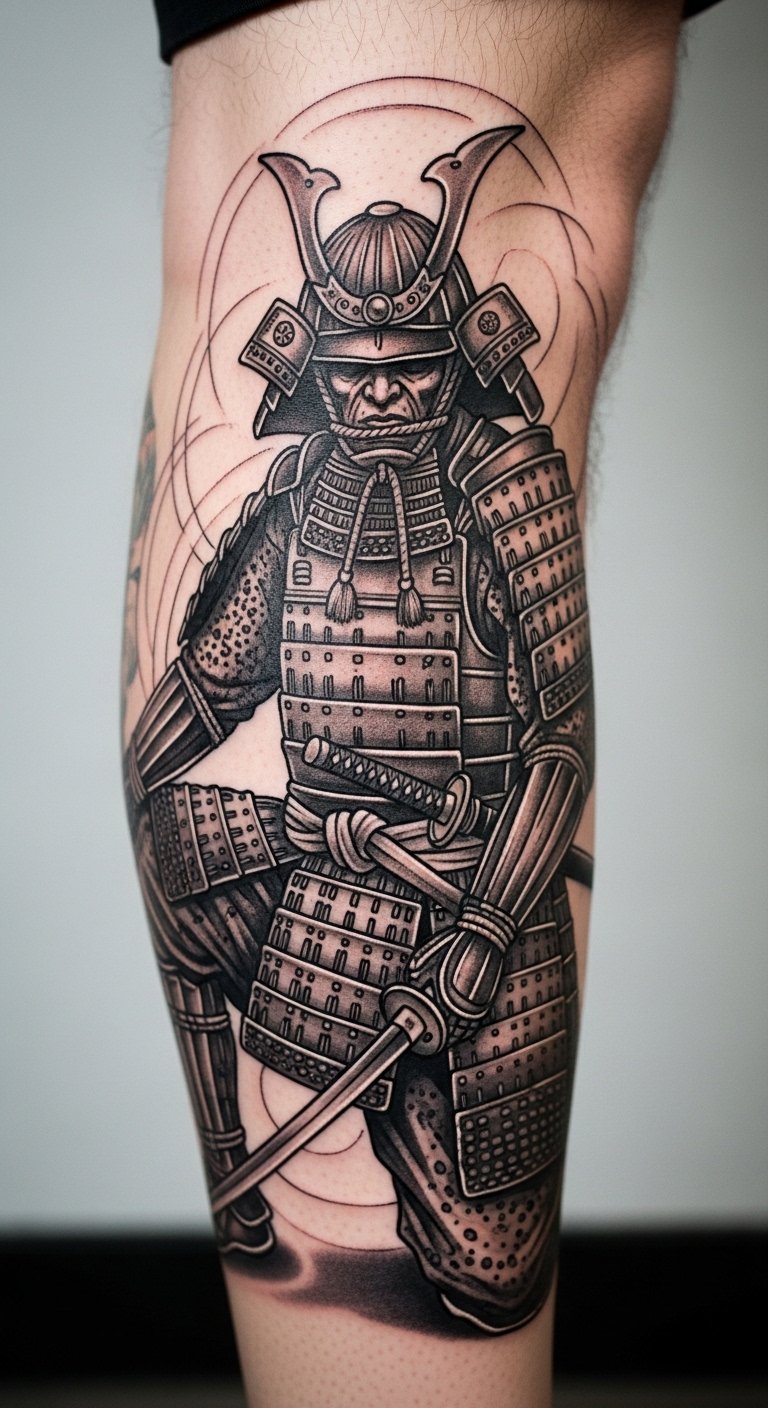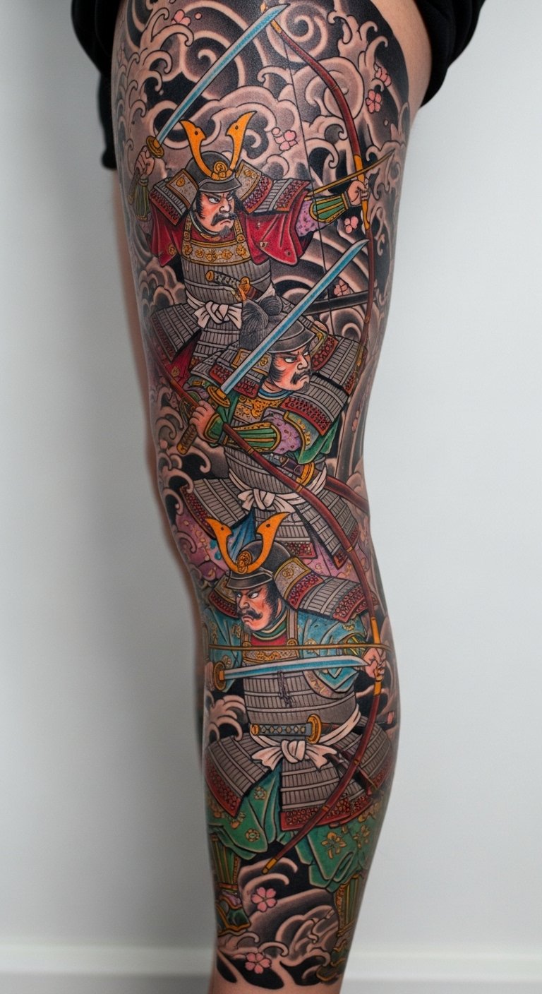 Dive into a battle-ready scene with samurais clashing, full of action and triumph. This design captures warriors in mid-fight, pushing you toward your goals. Sketch it quickly on a notebook with a pencil—takes minutes and zero dollars. Artists often have sales; aim for one around $90 for a compact version. Place it on your leg for a subtle yet strong statement. Bold feature: battle scene fuels determination. Personalize by adding a weapon that means something to you, using home drawings as inspiration. This keeps things practical and budget-friendly.