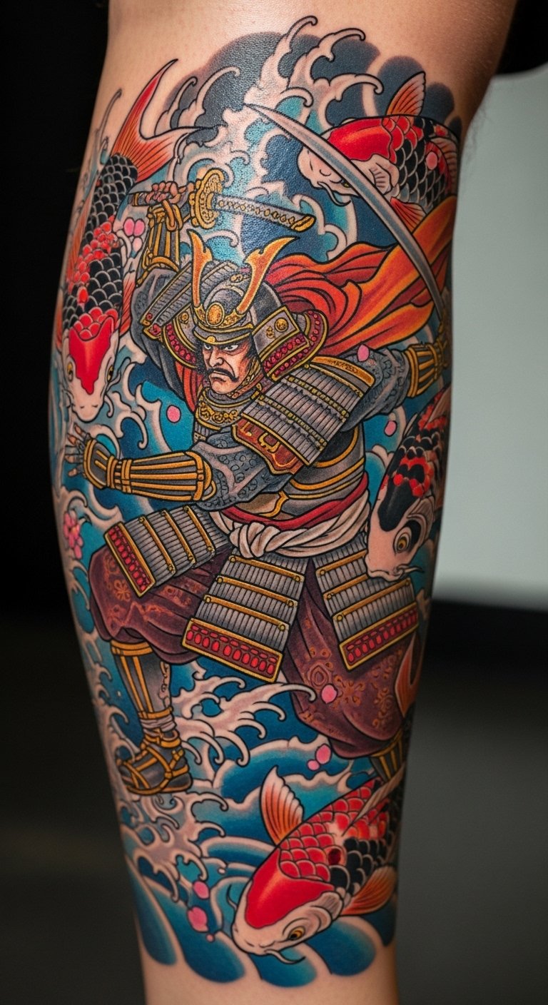 Koi fish swimming with a samurai symbolize perseverance and flow. This design blends the fish’s journey with a steady warrior, inspiring steady progress. Doodle koi shapes on paper with a pen—it’s free and quick. Find deals at tattoo expos for prices around $100. Put it on your calf for a meaningful, visible spot. Bold symbol: koi fish journey reflects growth. Add personal elements like waves through simple sketches. Keep it affordable and actionable.