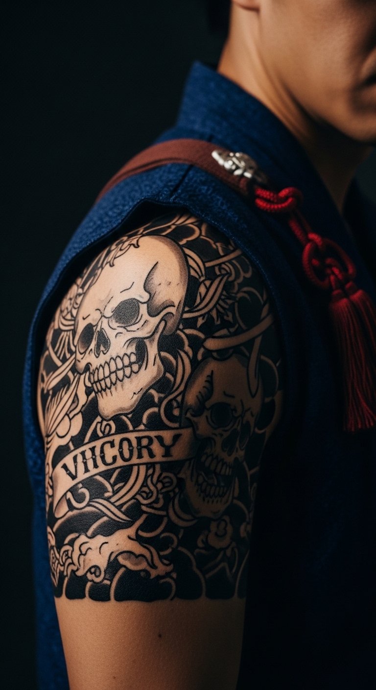 A skull with a victorious samurai nods to overcoming obstacles. This edgy design mixes death and triumph, motivating you through tough times. Practice by drawing skulls on scrap paper with a marker. Artists might offer flash sales for about $70. Choose your shoulder for easy hiding or showing. Bold motif: victory motif drives resilience. Tweak it with your story details using free apps. This makes it simple and budget-smart.