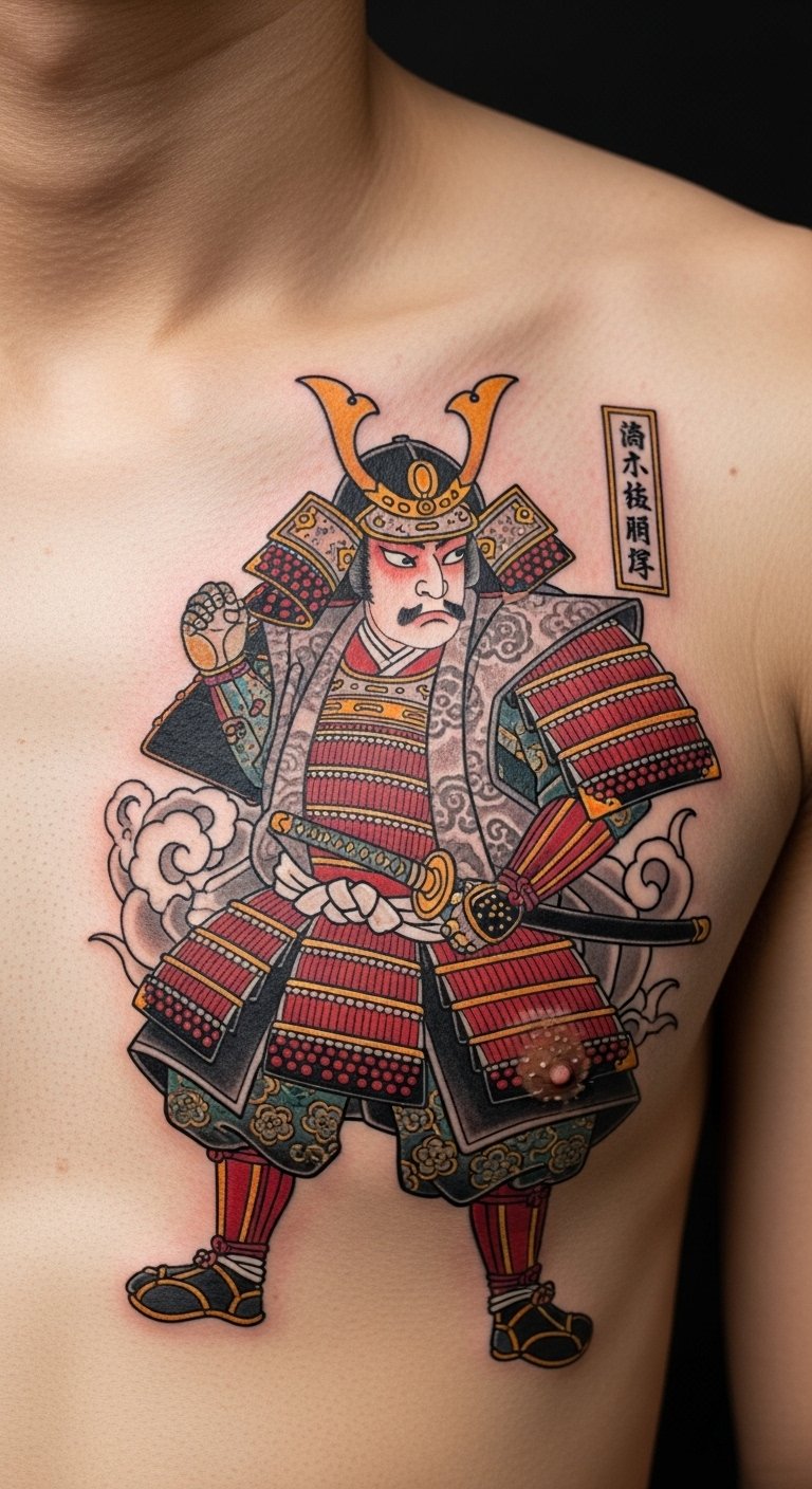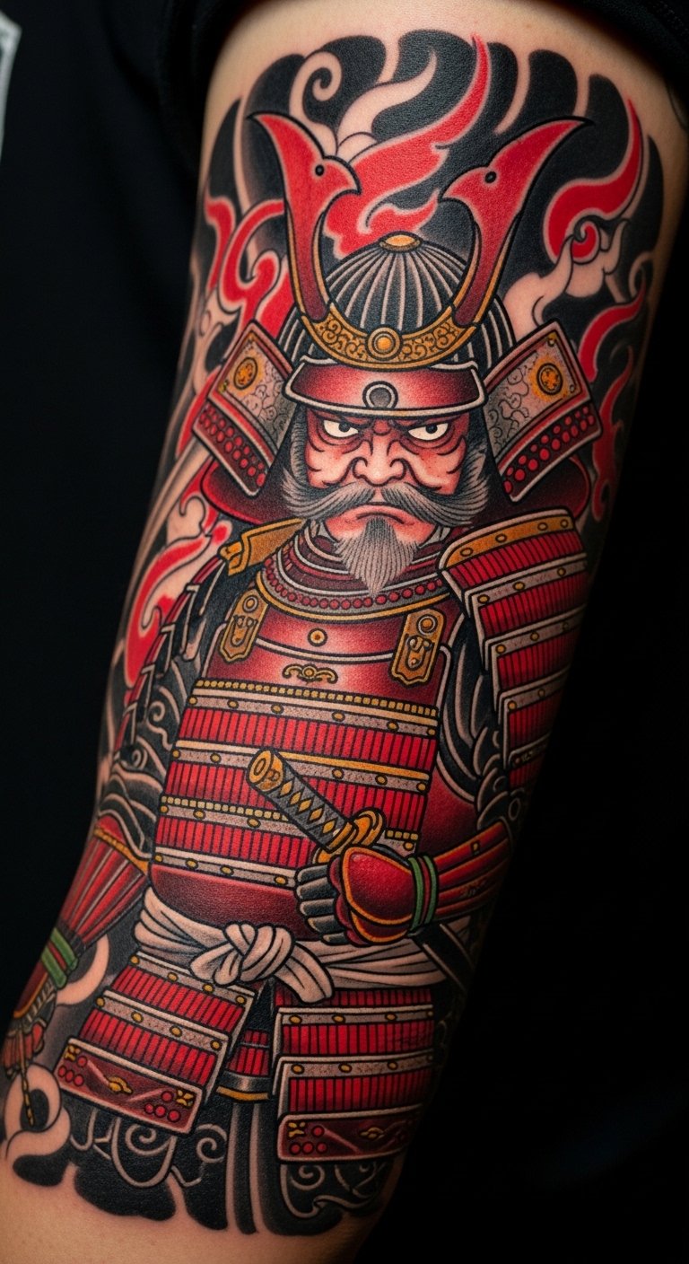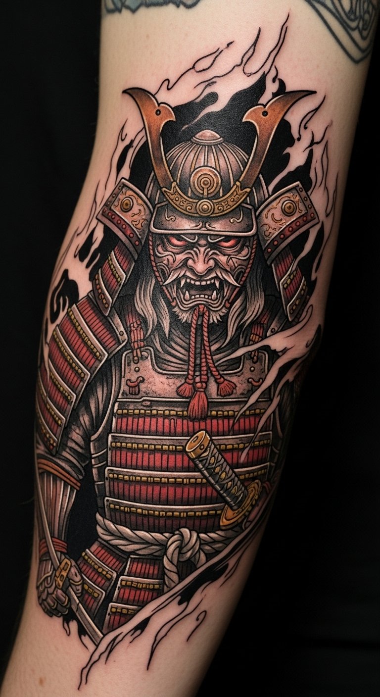 A colorful palette on a samurai adds vibrancy and life. This design pops with hues like red for passion. Experiment with colored markers at home—cheap and fun. Artists often discount colored work to $140. Put it on your arm for visibility. Bold palette: colorful samurai energizes you. Try different shades with temporary options first. Simple steps make it accessible.
