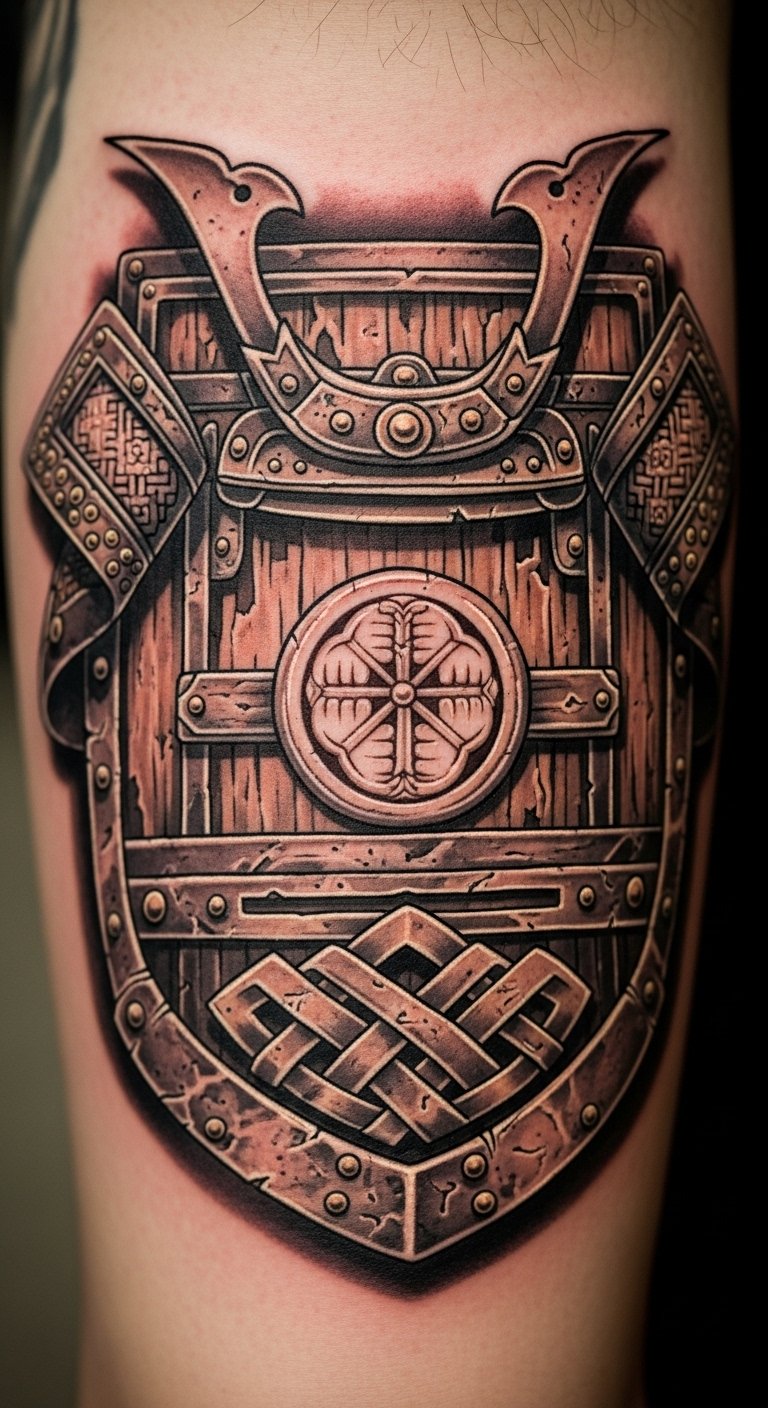 Protective shield design offers safety. Samurai with shields. Sketch shields. Artists at $70. On arm. Bold design: shield design guards you.