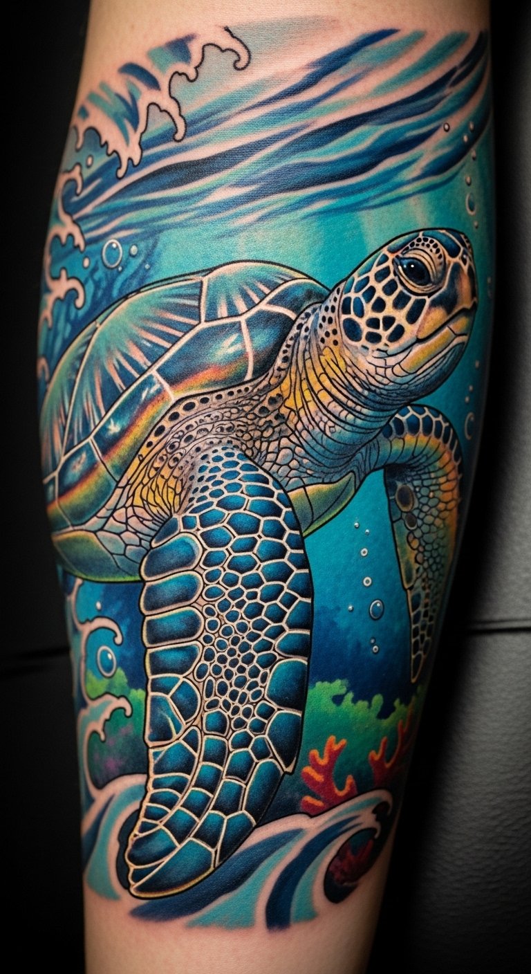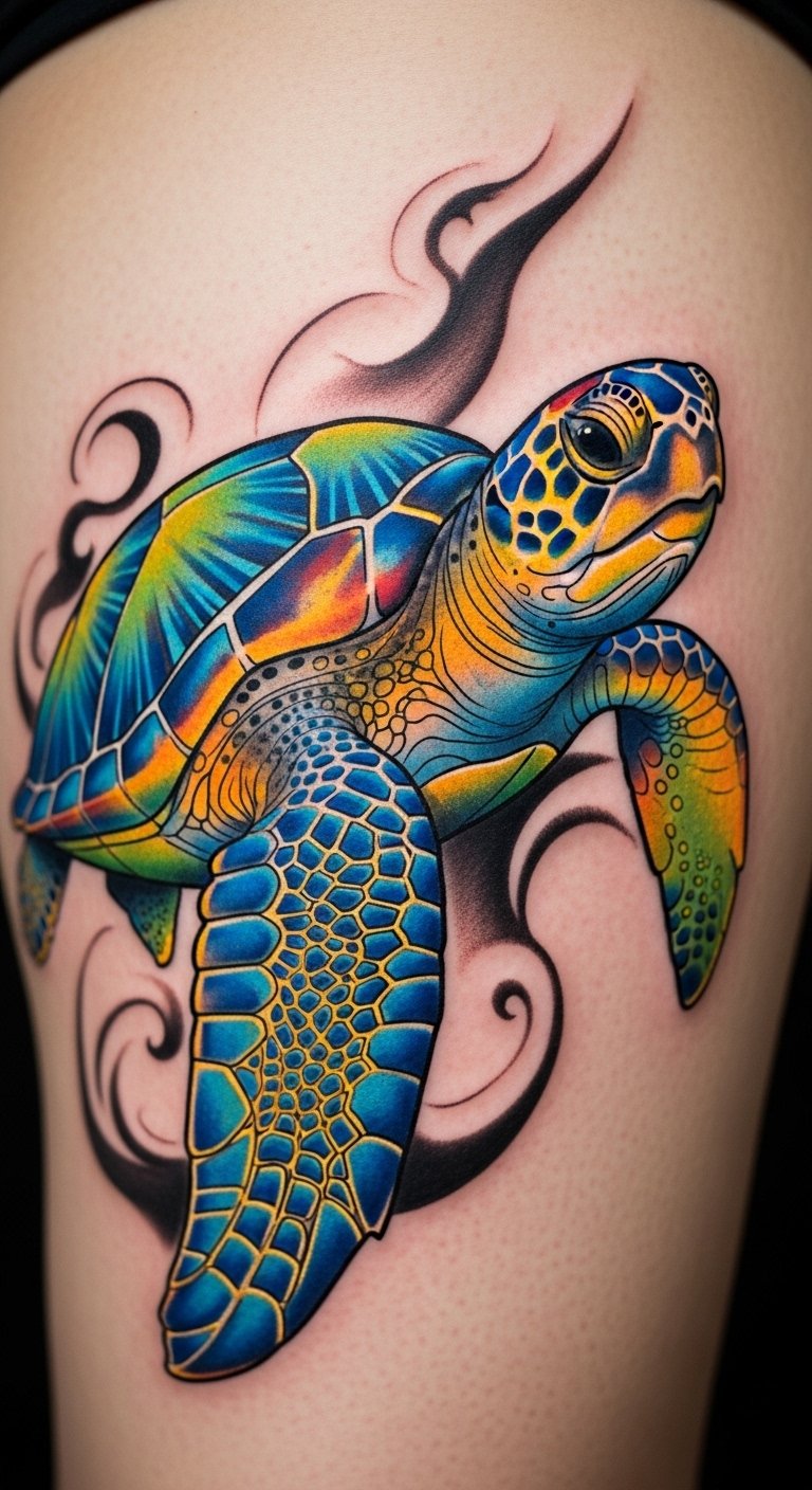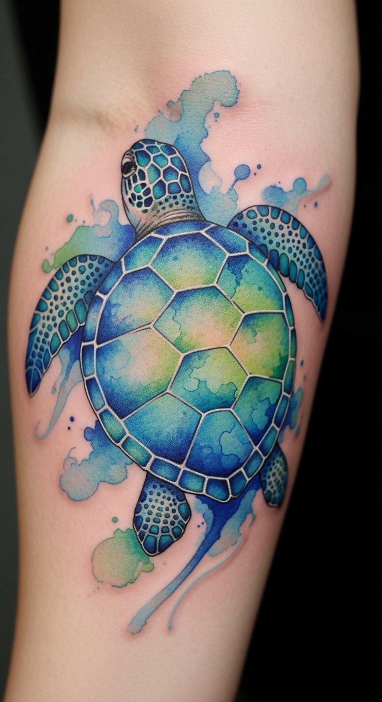 Think about a tattoo that flows like ocean waves. Watercolor sea turtles use soft colors for a fresh look. Start with a simple sketch on paper. Pick blues and greens from your art supplies. Get a temporary tattoo kit online for under $10 to test it. Add personal touches like wave lines. This style works for first-timers. It shows support for beach cleanups. Keep costs low by drawing your own design. Use free apps to color ideas digitally.