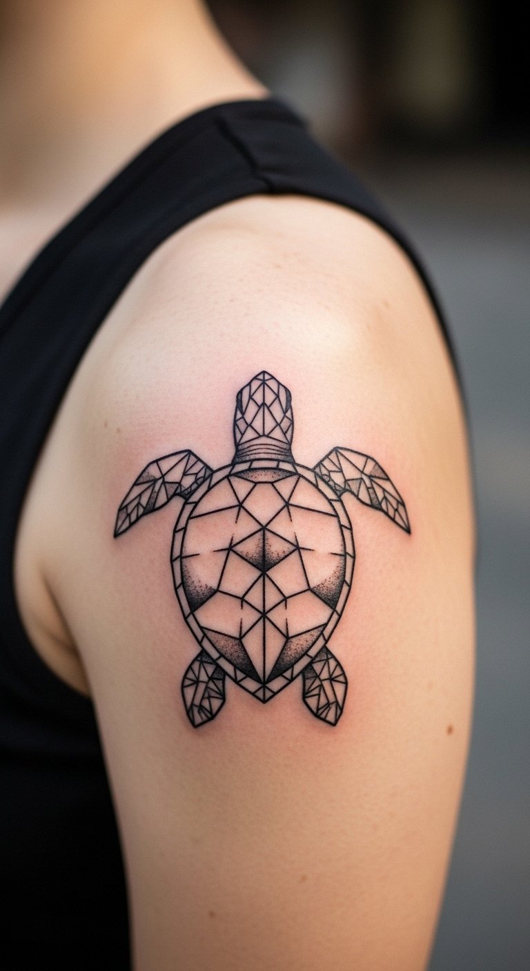 Shapes and lines make this design stand out. Geometric turtles use triangles and circles for a modern feel. Draw patterns on paper with a ruler. Find free templates online to copy. Use a marker for a DIY version at home. Place it where you see it daily, like your wrist. This tattoo nods to marine sanctuaries. Ink small versions to save money. Try henna as a trial run for $5. It reminds you to join local cleanups.