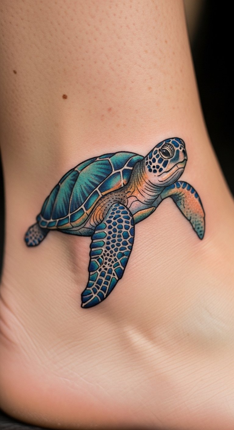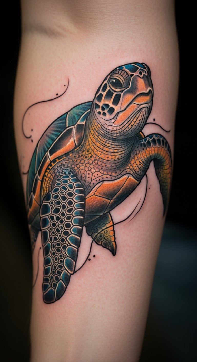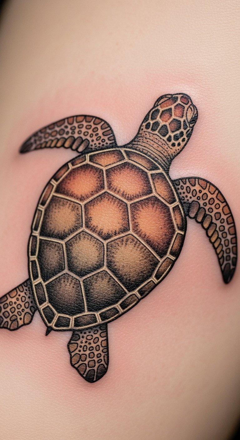Bring the ocean to life with this style. Realistic tattoos copy real turtles with fine details. Practice drawing from nature photos. Use affordable pencils to sketch at home. A basic drawing app on your phone works too. Opt for a smaller size to cut costs. This design highlights endangered species. Wear it proudly at conservation events. Test with a temporary sticker first. It encourages simple actions like reducing plastic use.