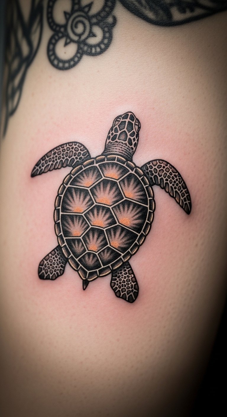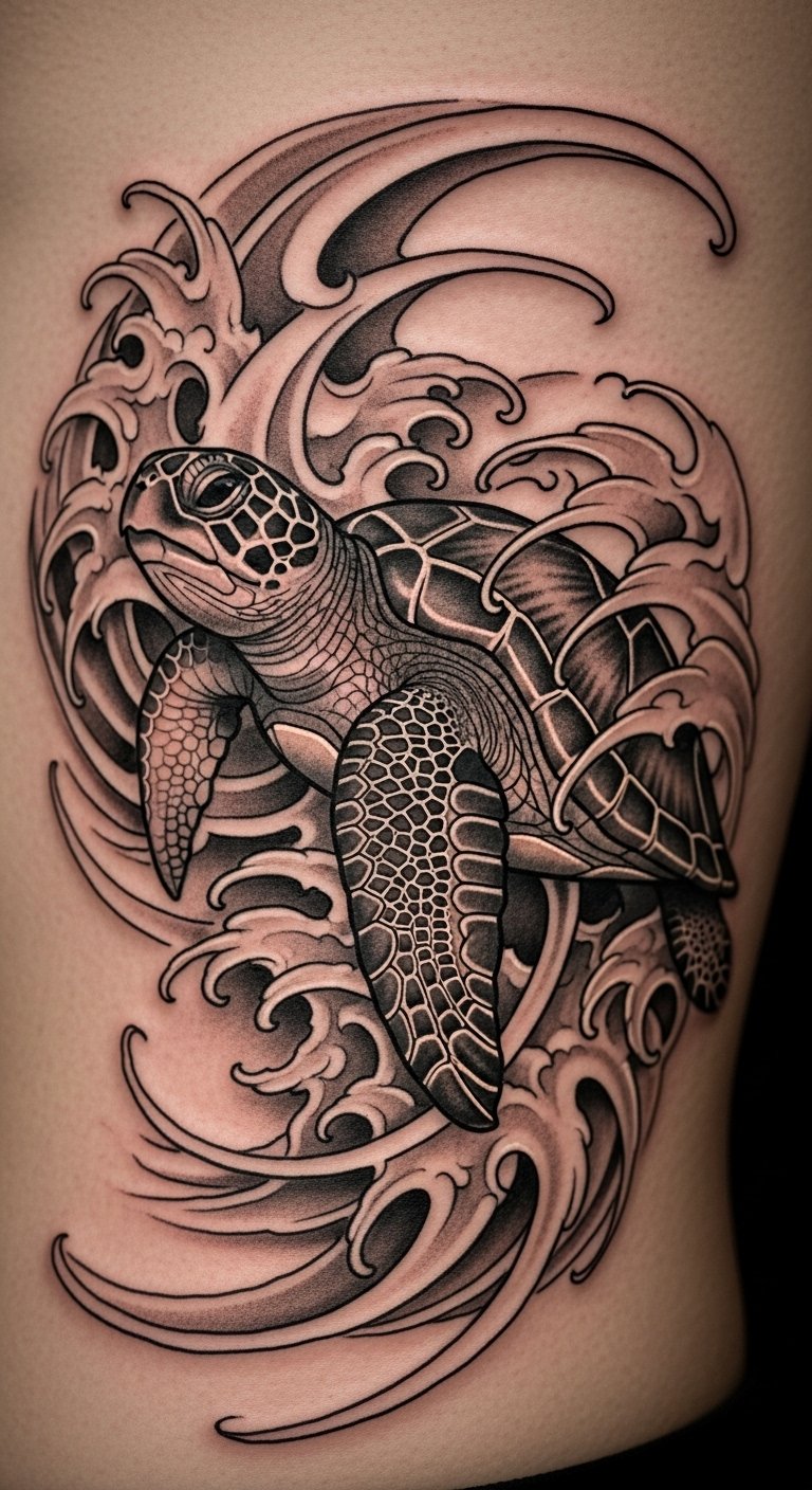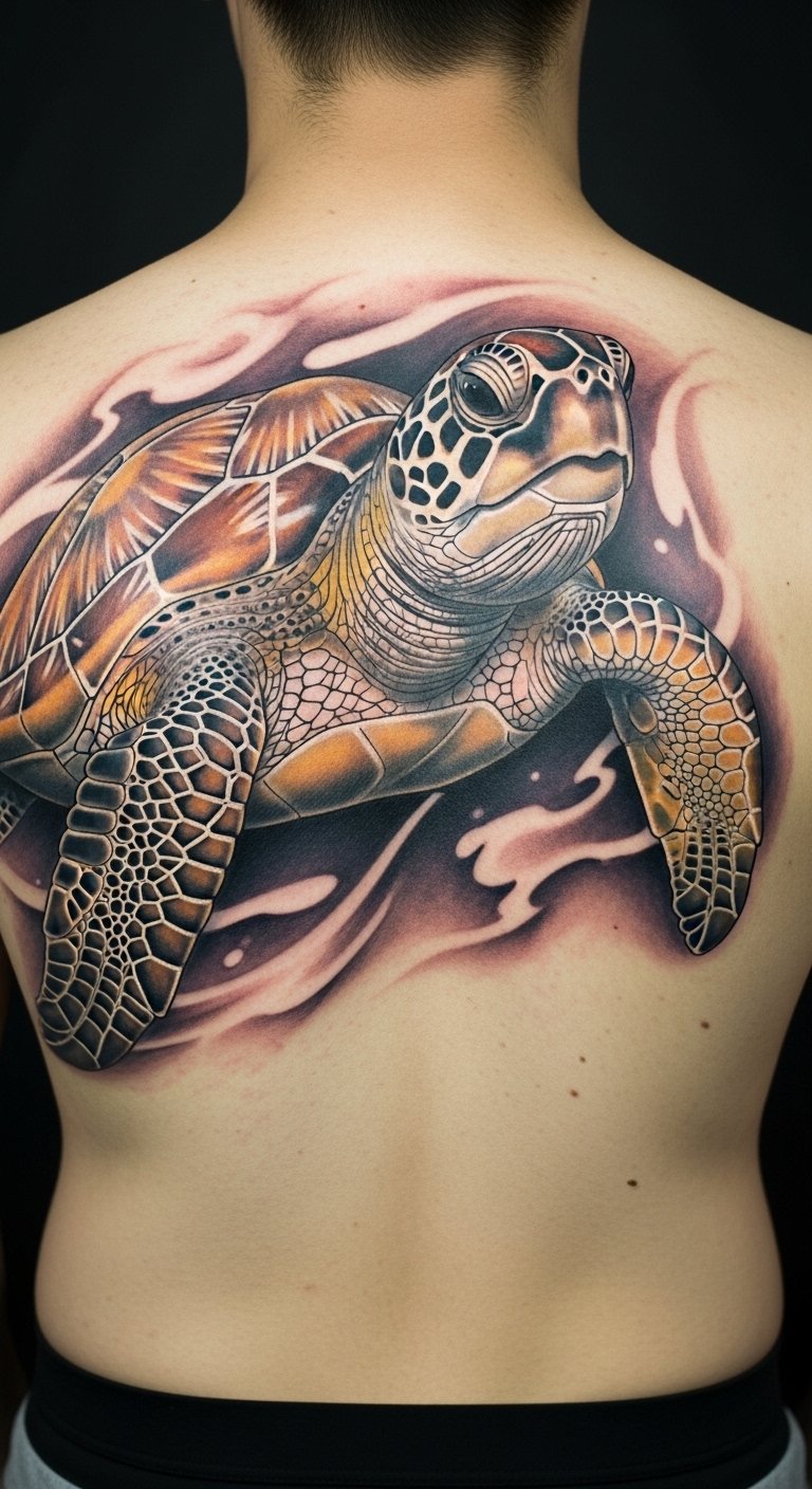 Bring the ocean to life with this style. Realistic tattoos copy real turtles with fine details. Practice drawing from nature photos. Use affordable pencils to sketch at home. A basic drawing app on your phone works too. Opt for a smaller size to cut costs. This design highlights endangered species. Wear it proudly at conservation events. Test with a temporary sticker first. It encourages simple actions like reducing plastic use.