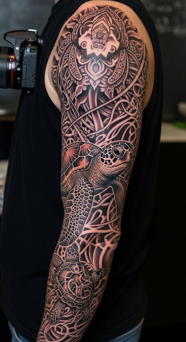 Cover more ground with a sleeve. Build it with turtle themes. Start with sketches on large paper. Apps help plan the layout. Piece it together with cheap tattoos. This tells a full ocean story. Add elements over time to budget. It motivates comprehensive conservation efforts. Draw sections at home first.