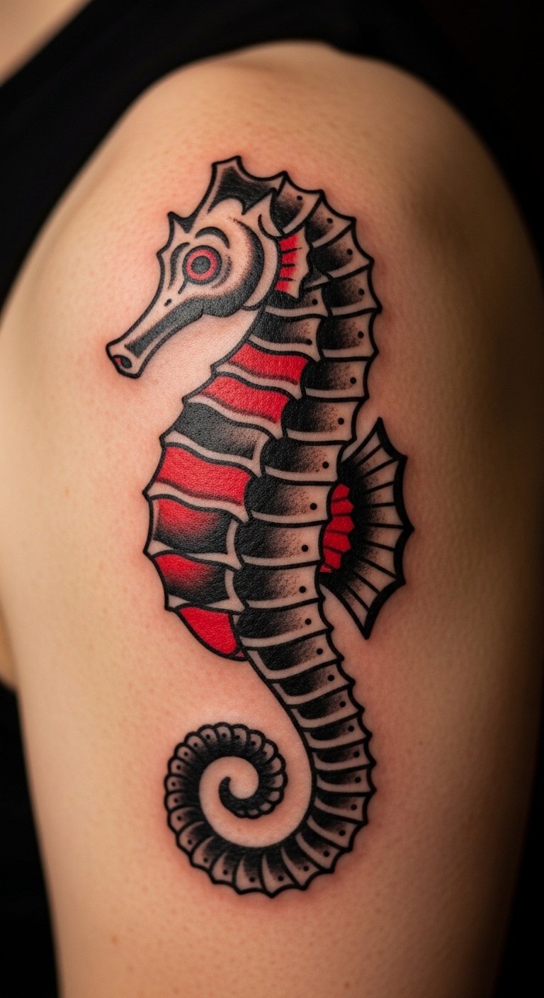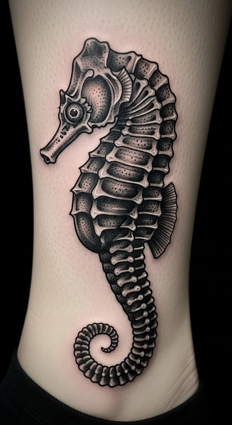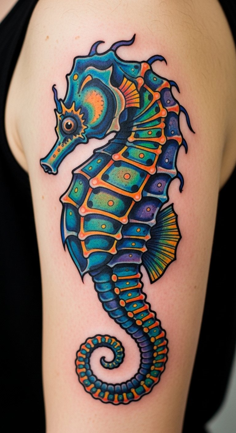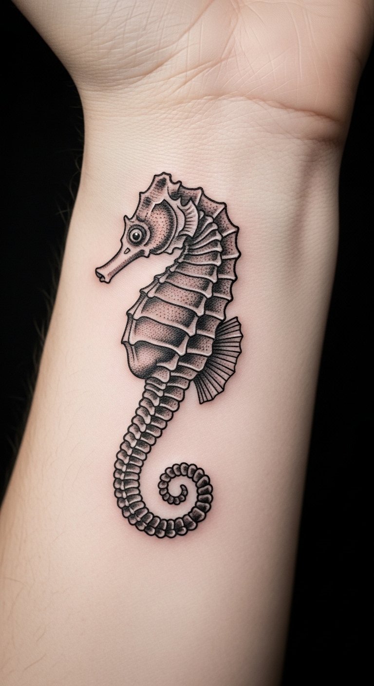 Think about a seahorse in bold, timeless lines. This design draws from old-school tattoo art. It uses simple shapes and colors that stand out. You get a symbol of protection and family right on your skin. Start with a sketch on paper. Use a basic pen to trace a seahorse outline. This helps you tweak ideas before hitting the studio. Keep costs low by visiting local artists who offer flash designs. They often have set prices under $100. Add a personal twist, like a small wave, using free online templates. Practice drawing on your arm with washable markers. It makes the process fun and easy. Real talk: this tattoo works great on the forearm for daily visibility. Go for it if you want something sturdy yet meaningful.