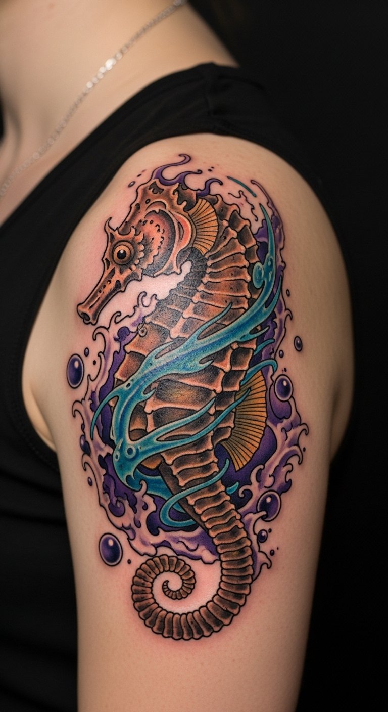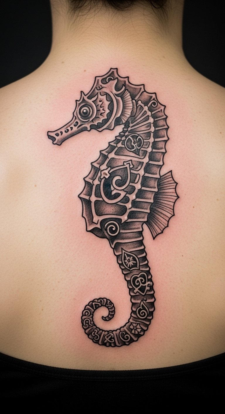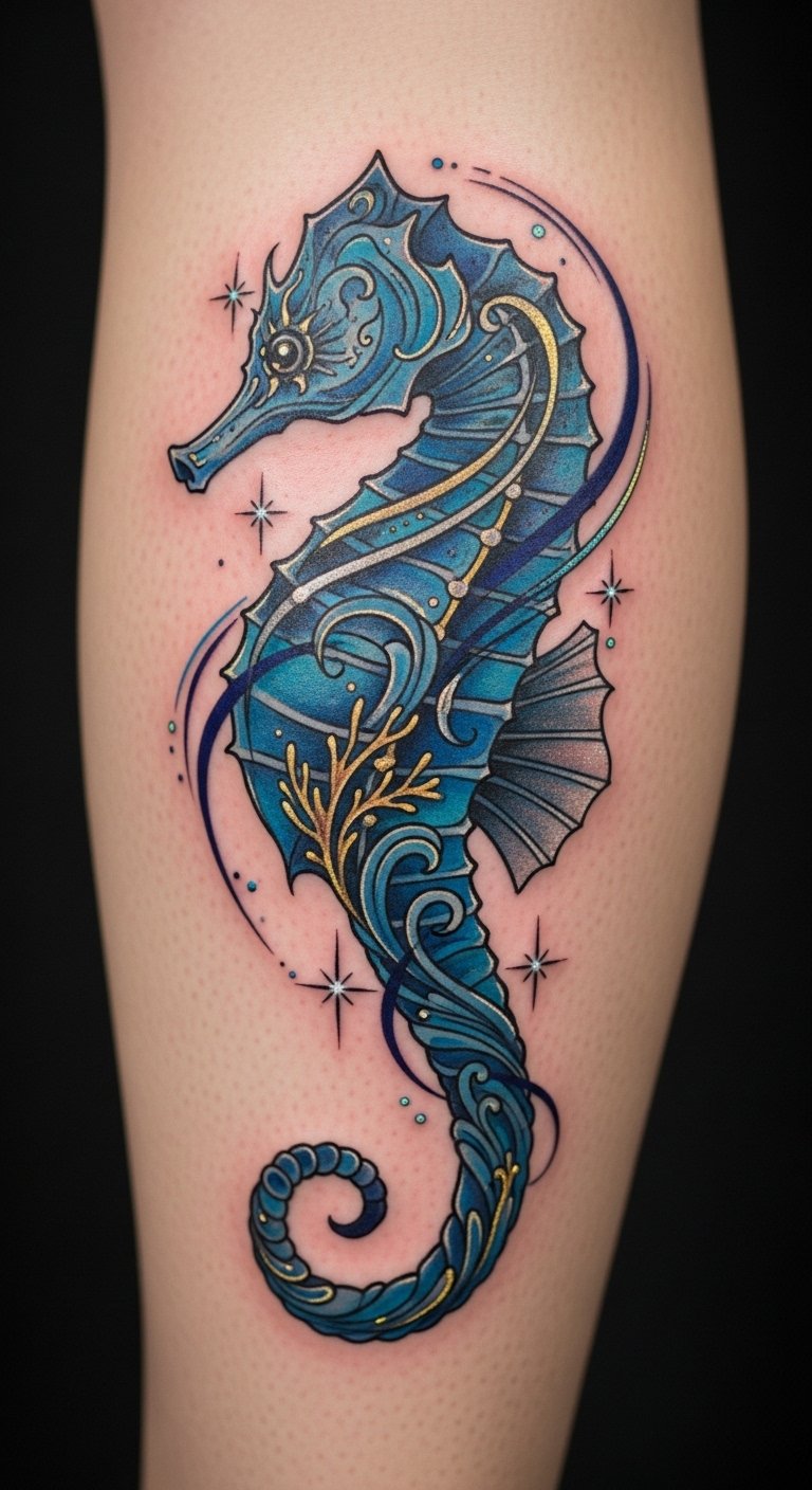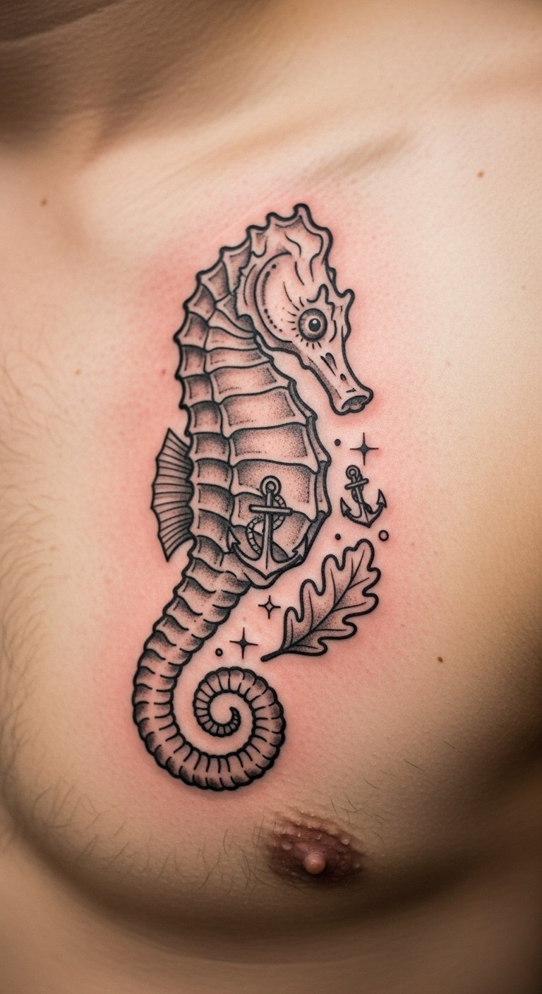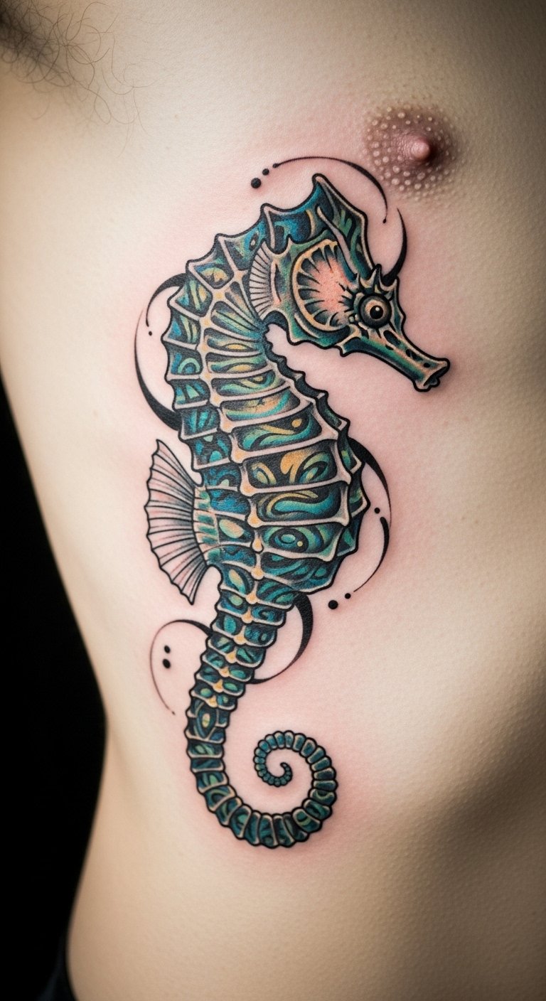 Think about a seahorse in bold, timeless lines. This design draws from old-school tattoo art. It uses simple shapes and colors that stand out. You get a symbol of protection and family right on your skin. Start with a sketch on paper. Use a basic pen to trace a seahorse outline. This helps you tweak ideas before hitting the studio. Keep costs low by visiting local artists who offer flash designs. They often have set prices under $100. Add a personal twist, like a small wave, using free online templates. Practice drawing on your arm with washable markers. It makes the process fun and easy. Real talk: this tattoo works great on the forearm for daily visibility. Go for it if you want something sturdy yet meaningful.
