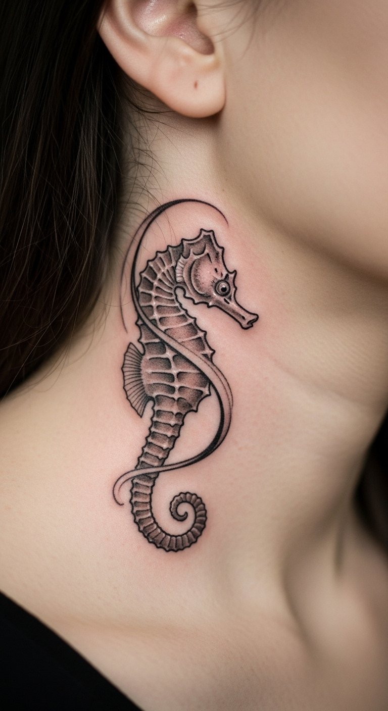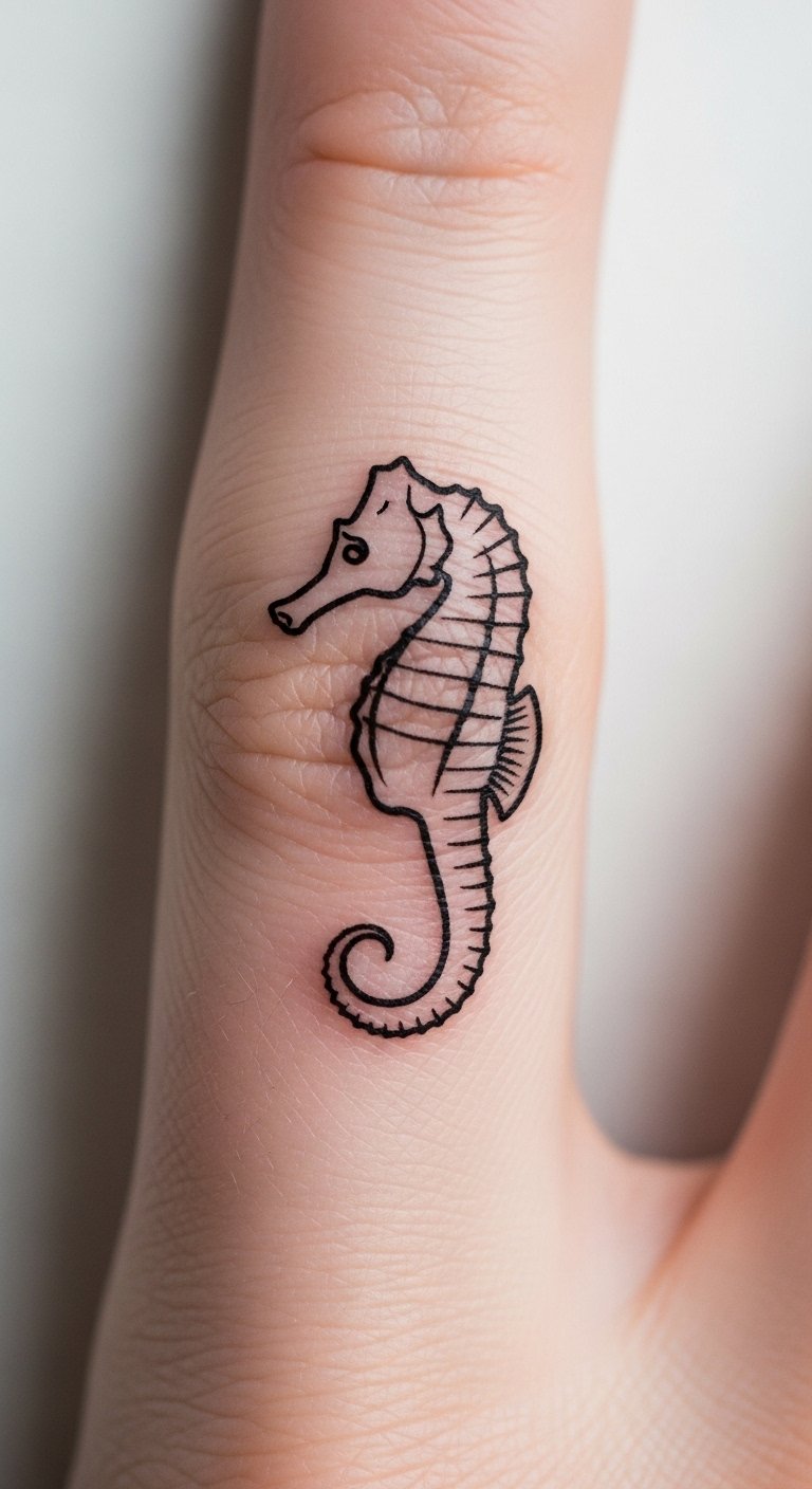 Go for clean lines with a minimalist seahorse. It’s all about subtle grace and peace. This style fits if you want something understated yet powerful. Draw it yourself on paper with a fine-tip pen. Free apps offer templates to guide you. It saves money and builds excitement. Look for artists who specialize in small tattoos; prices start at $50. Add a dot for a family touch. Test with henna or temporary ink from the drugstore. Aim for spots like the ankle for easy hiding. This way, you make a statement without much fuss. Keep your design personal and light on the wallet.