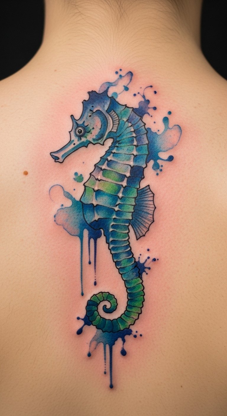Use bright colors to show a seahorse’s resilience. It stands for overcoming tough times with style. Start with colored pencils on paper. Free tools online help you play with shades. This step costs nothing extra. Check for sales at tattoo parlors; sessions under $120. Customize with a wave pattern. Practice with affordable markers on your skin. Put it on your back for a bold statement. Keep it real and motivating.