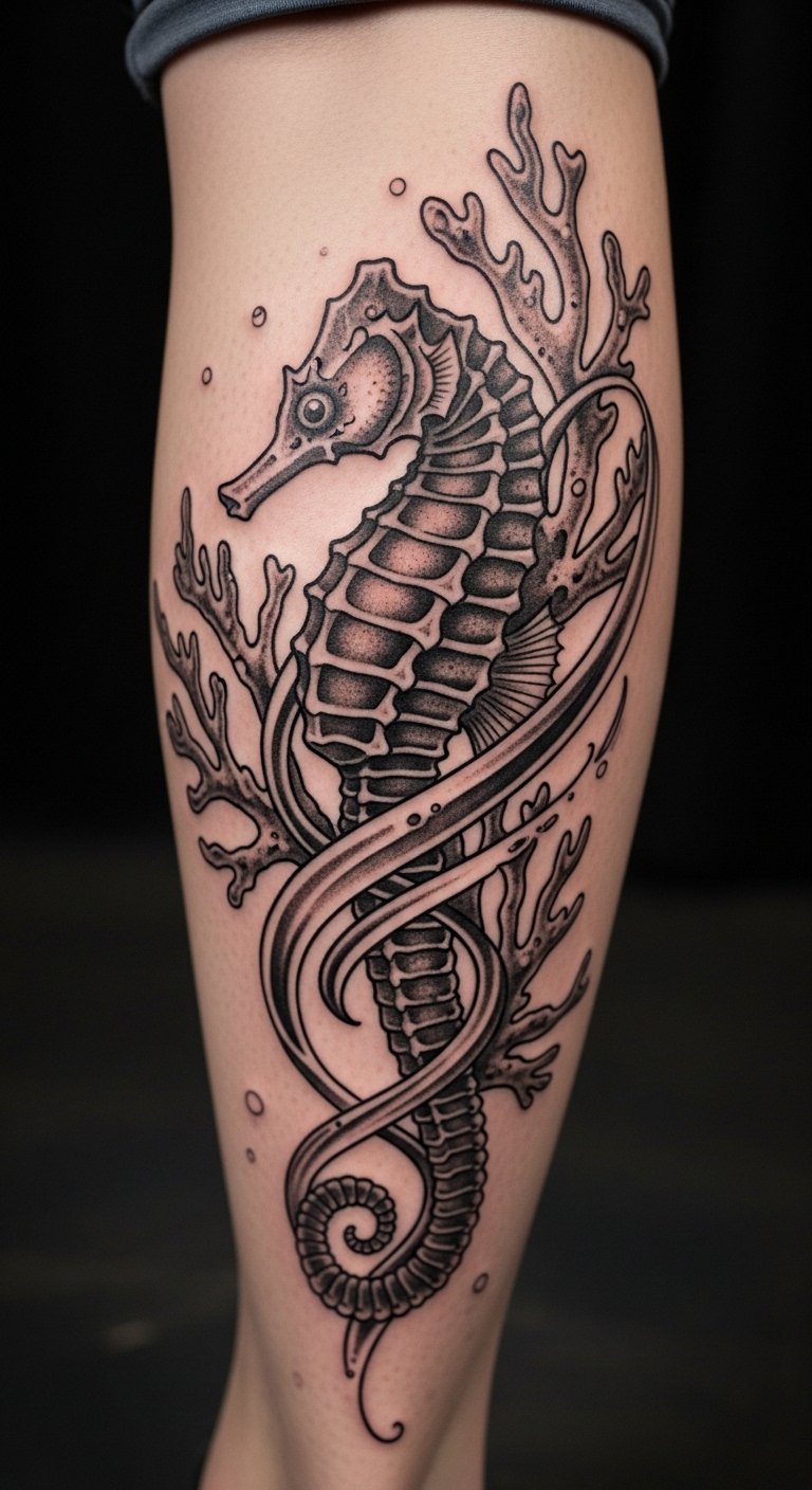Realistic Blackwork Seahorse Tattoo