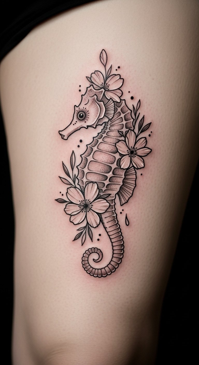 Blend flowers with a seahorse for pure beauty. It symbolizes growth and nurture together. Practice on paper with colored markers. Free resources online spark ideas. This makes it fun and cheap. Find artists offering combos for $110. Personalize with your favorite bloom. Try drawing with washable ink first. Go for the leg to display it. This design enhances your look without much expense.