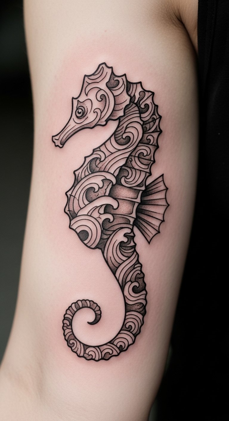 Incorporate waves for a calming seahorse. It promotes peace and flow. Draw wavy lines at home. Free videos teach basics. This relaxes you first. Look for budget options at $80. Personalize with smooth curves. Use water-based pens to try. Place it on your arm. This idea soothes easily.