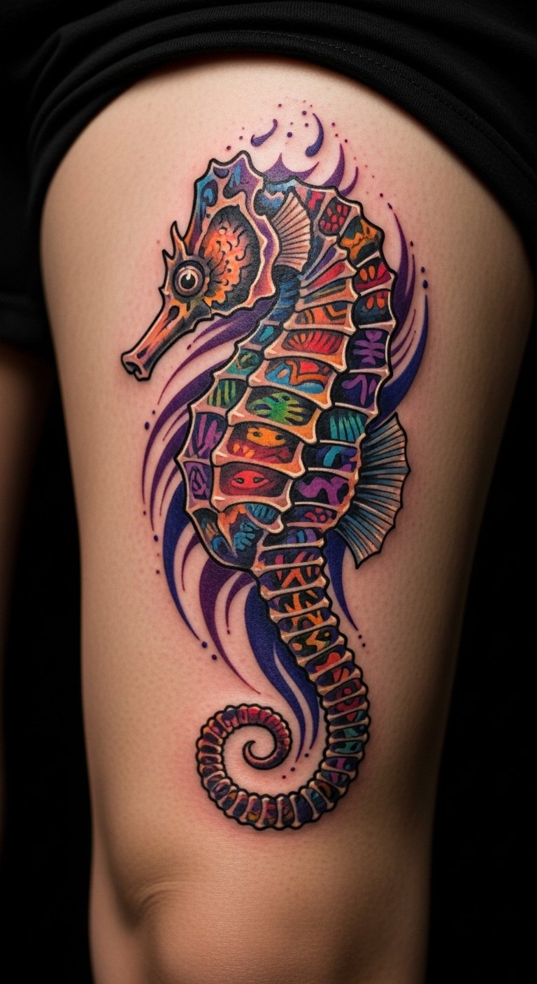 Fuse art styles in your seahorse. It creates a fresh, expressive look. Experiment on paper with mixes. Free apps assist. This keeps creativity cheap. Artists offer fusions for $90. Add your twists. Practice with mixed media. Opt for the thigh. This design sparks joy affordably.